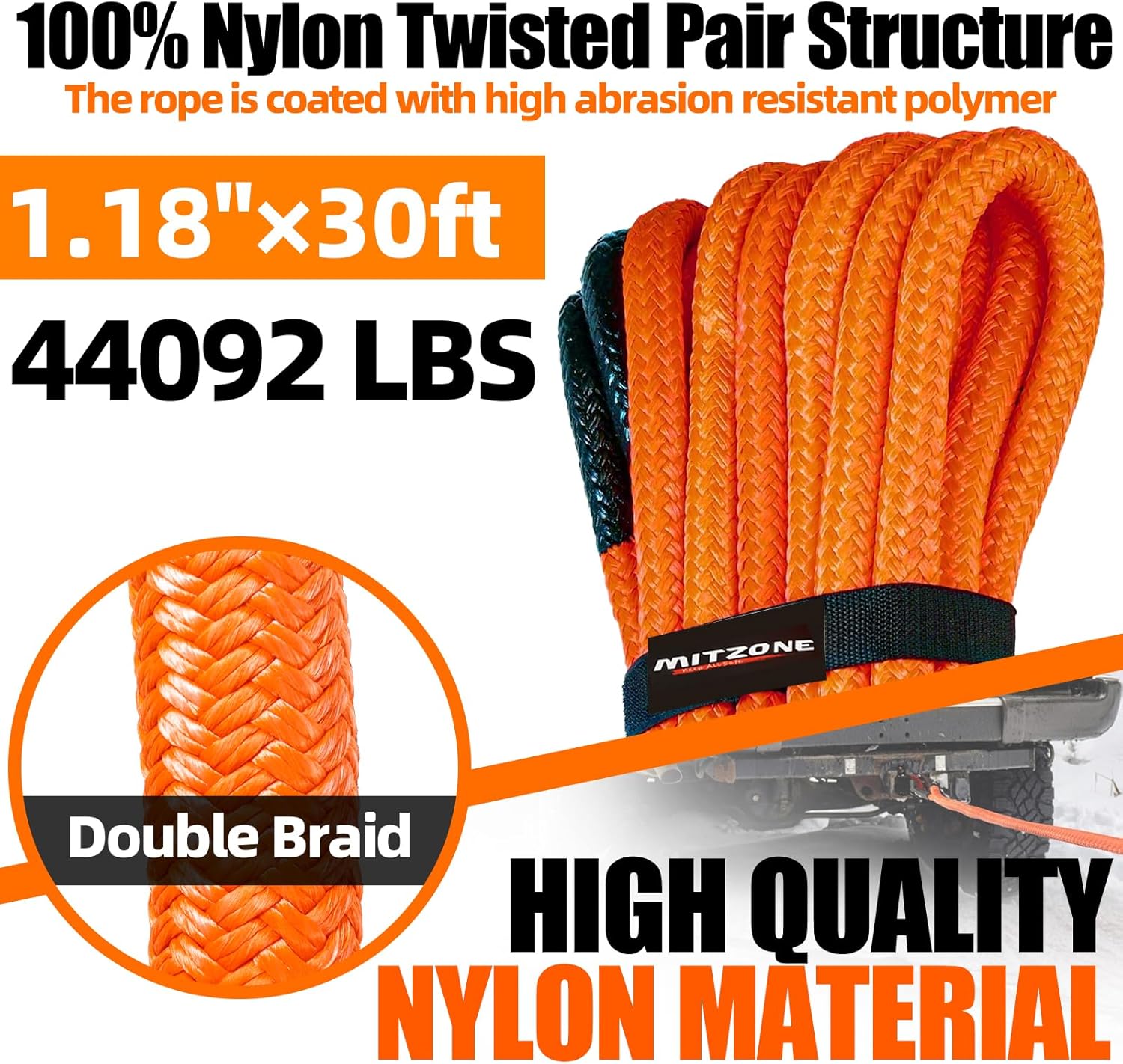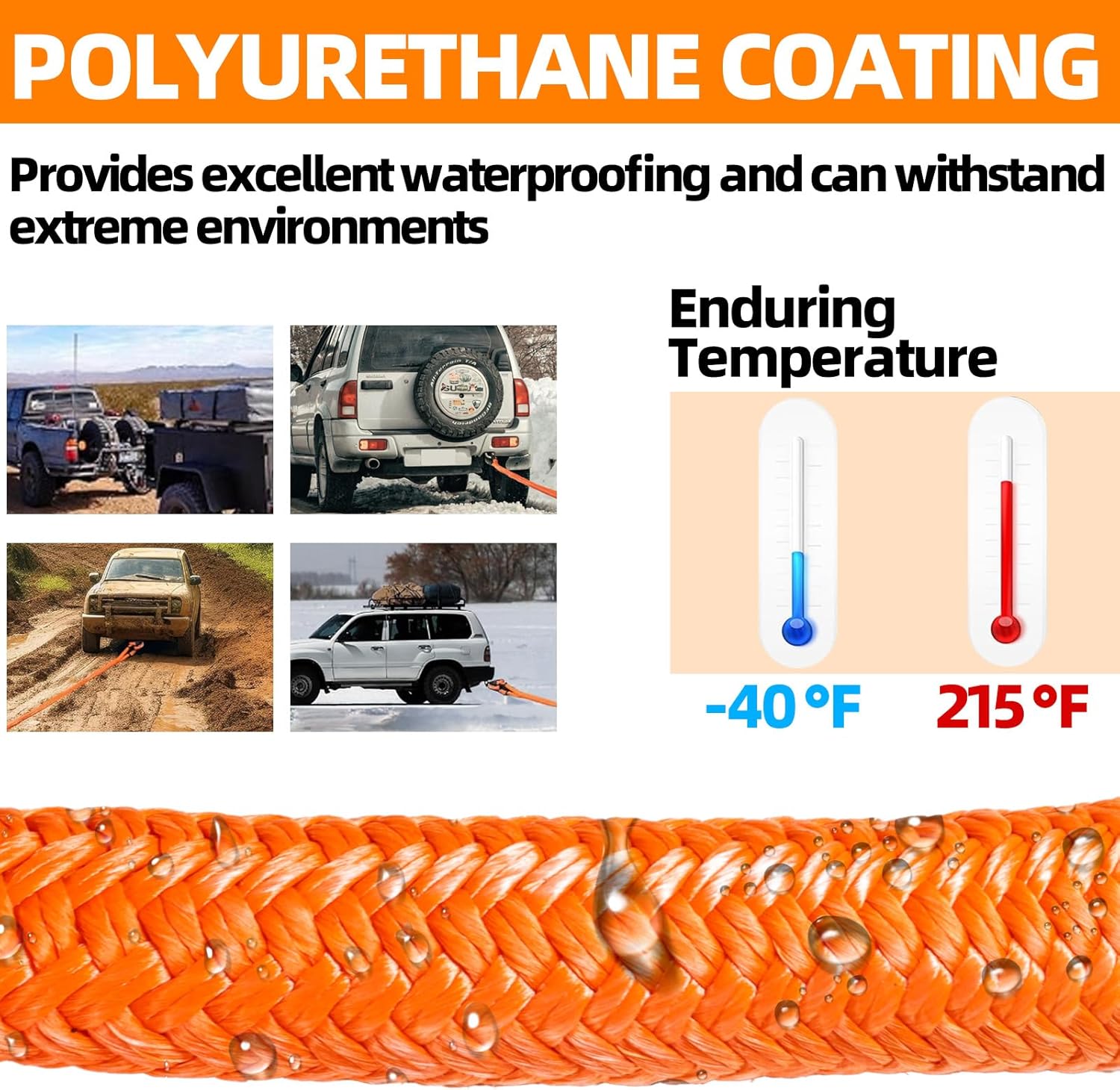 - Double Diamond Braid and Vinyl Polymer Coating: The double braid shell of our recovery strap is infused with a vinyl polymer coating, offering exceptional waterproof and UV-resistant properties. Withstanding temperatures ranging from -40Β°F to 215Β°F, it ensures durability in extreme conditions. Additionally, both ends of the recovery straps heavy duty feature polyurethane coatings for increased wear resistance, corrosion protection, and easy cleaning