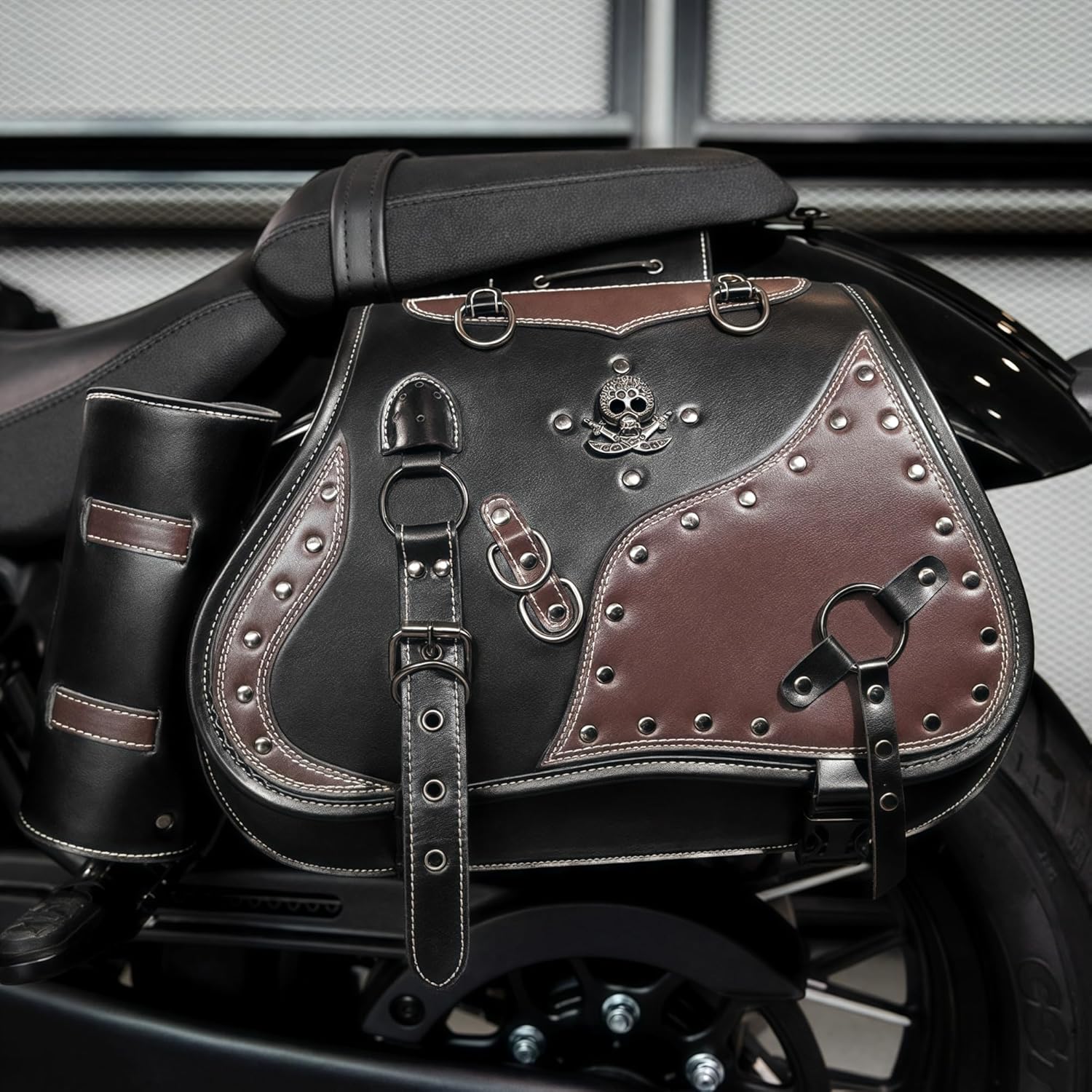- â ăPremium PU Leather & Exquisite Metal Locks and Trimă-- Made of selected PU leather and high-quality polished hardware are made of exquisite and smooth edges of the bag, with exquisite paint spraying process, and the metal parts are polished smooth and bright. Compared with ordinary PVC leather saddle bags, it is not only more delicate and advanced, but also more durable, waterproof and scratch-resistant. The unique rivet streamline design exudes an elegant retro punk flavor, making your ride eye-catching and luxurious.