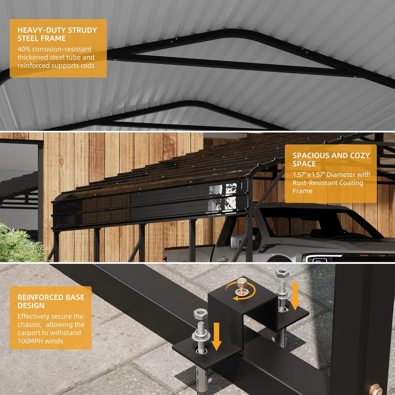 - UPGRADED AND ENHANCED BASE - To guarantee stability, the metal carport is furnished with heavy-duty anchor rods and offers 6 reinforcing support rods that can be installed on various surfaces, ensuring remarkable stability and durability even in adverse weather. The car port metal roof is made of galvanized steel, which is rust-resistant and highly durable. The upgraded sloping canopy facilitates rapid water drainage.