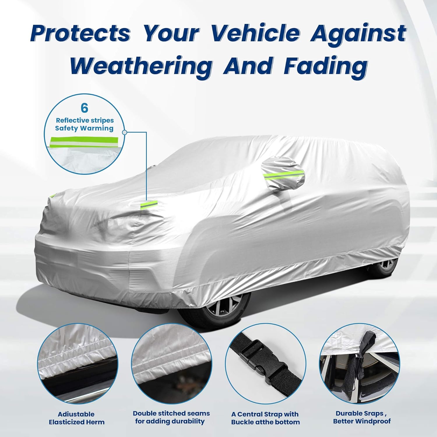 - Comprehensive All-Weather Protection: Engineered to withstand all weather conditions, our SUV Car Cover delivers unmatched protection against rain, snow, wind, and harsh sun. Whether it's the blistering heat of summer or the icy grip of winter, our cover remains resilient, ensuring your vehicle stays in pristine condition all year round, ideal for those needing all weather car cover or outdoor car cover waterproof all weather