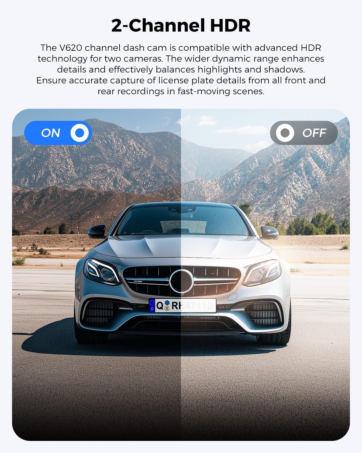- ăADVANCED NIGHT VISIONăEquipped with an F1.8 large-aperture lens and 6-layer glass optics, along with HDR/WDR technology, the dash cam delivers sharp, balanced video even in low-light or high-contrast conditions.