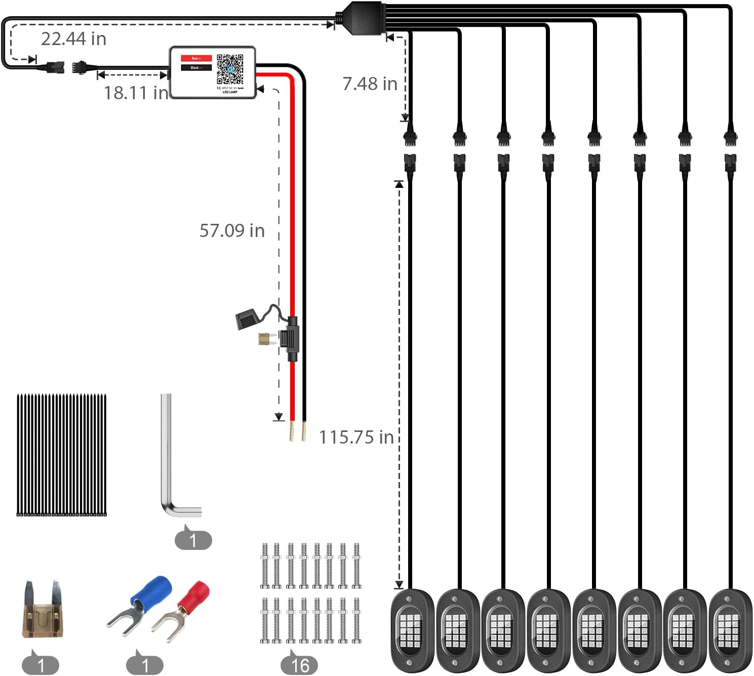- â¶ăExtra Wiring for Added LengthăThis RGB rock lights kits includes extra wiring length for different vehicles. The length of each pod cords is about 118 inches. If your car is large, you may need to purchase additional extension cables. Purchase Rock Light Extension Wire ASIN: B0BL72N5XW