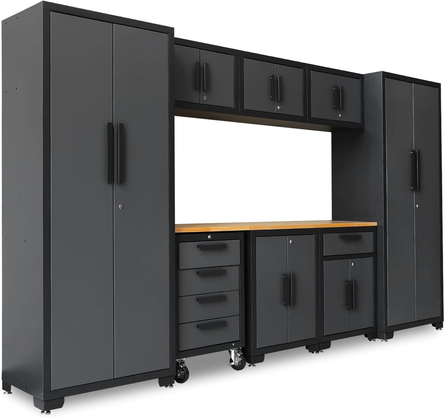 - Torin 9 piece Storage Cabinet Set Includes: Locker x 2, 2-door base cabinet x 1, 1-drawer 2-door base cabinet x 1, 4-drawer with casters x 1, wall cabinet x 3, Pressed Wooden Board x 1 and features a fully welded steel structure for added support