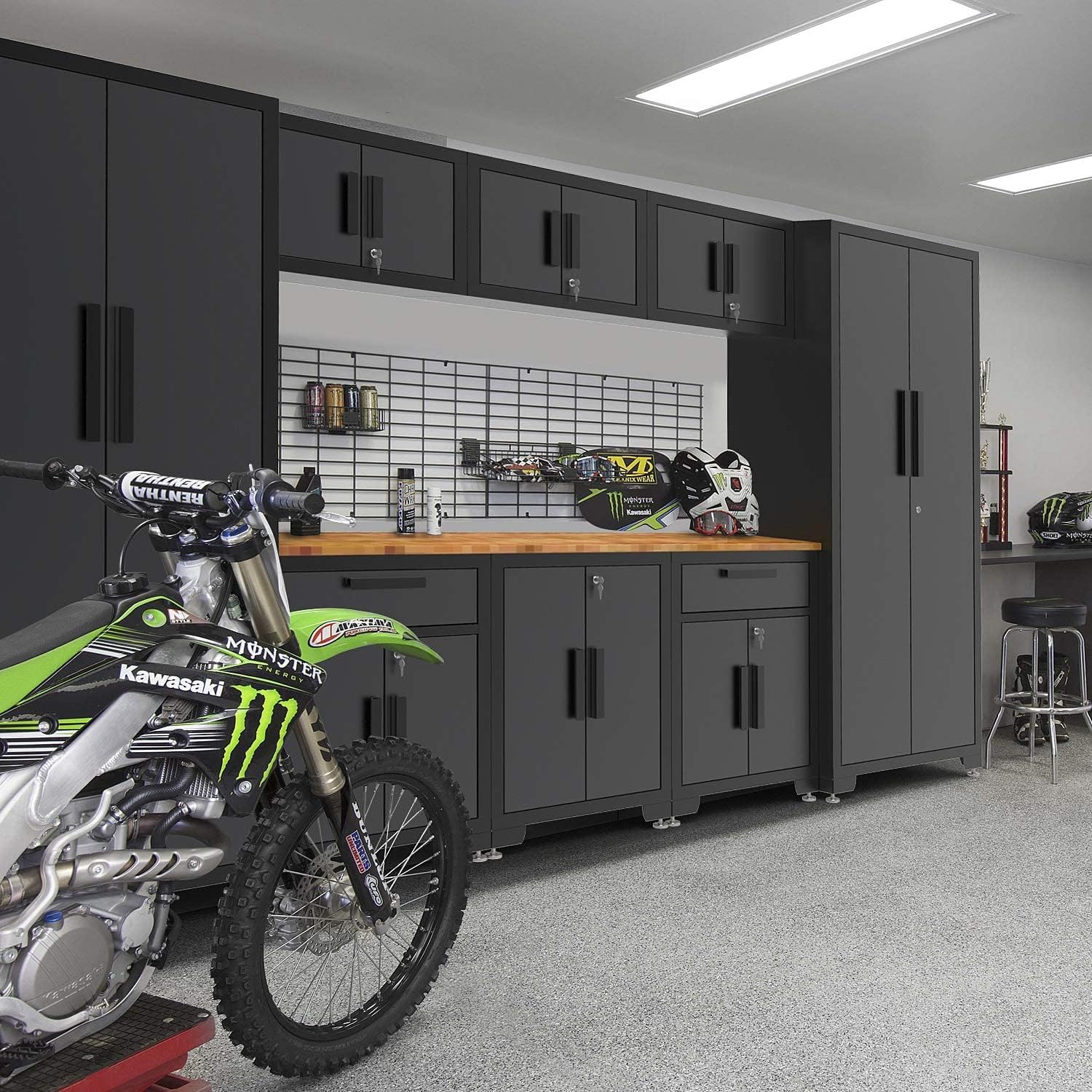 - This garage storage cabinet is constructed with a scratch and stain resistant powder coated finish steel. Equipped with a 1" thick wood worktop which is convenient to operate most tools. The countertop support plate is installed on the side of the tall cabinet to support one end
