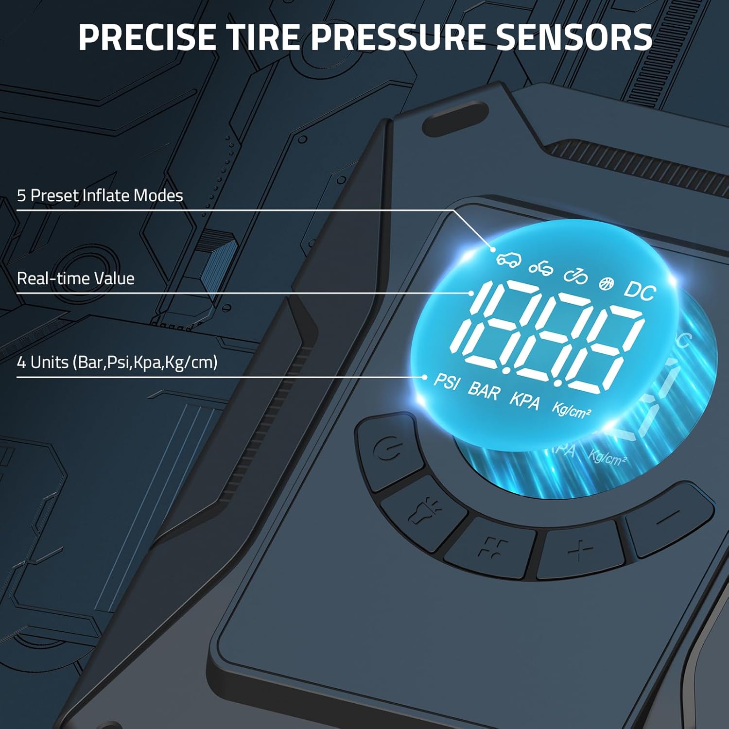 - 【LED LIGHT & REAL-TIME DIGITAL SCREEN】 Bright backlight LCD display makes for convenient use at night, help you check the tyre pressure and preset the tyre presure values. The air compressor gauge can display the pressure in PSI, KPA, BAR & KG/CM². PAULINN air pump is equipped with bright and long-lasting LED lights, it has 2 modes (night light & SOS light), easy to use even in the dark.