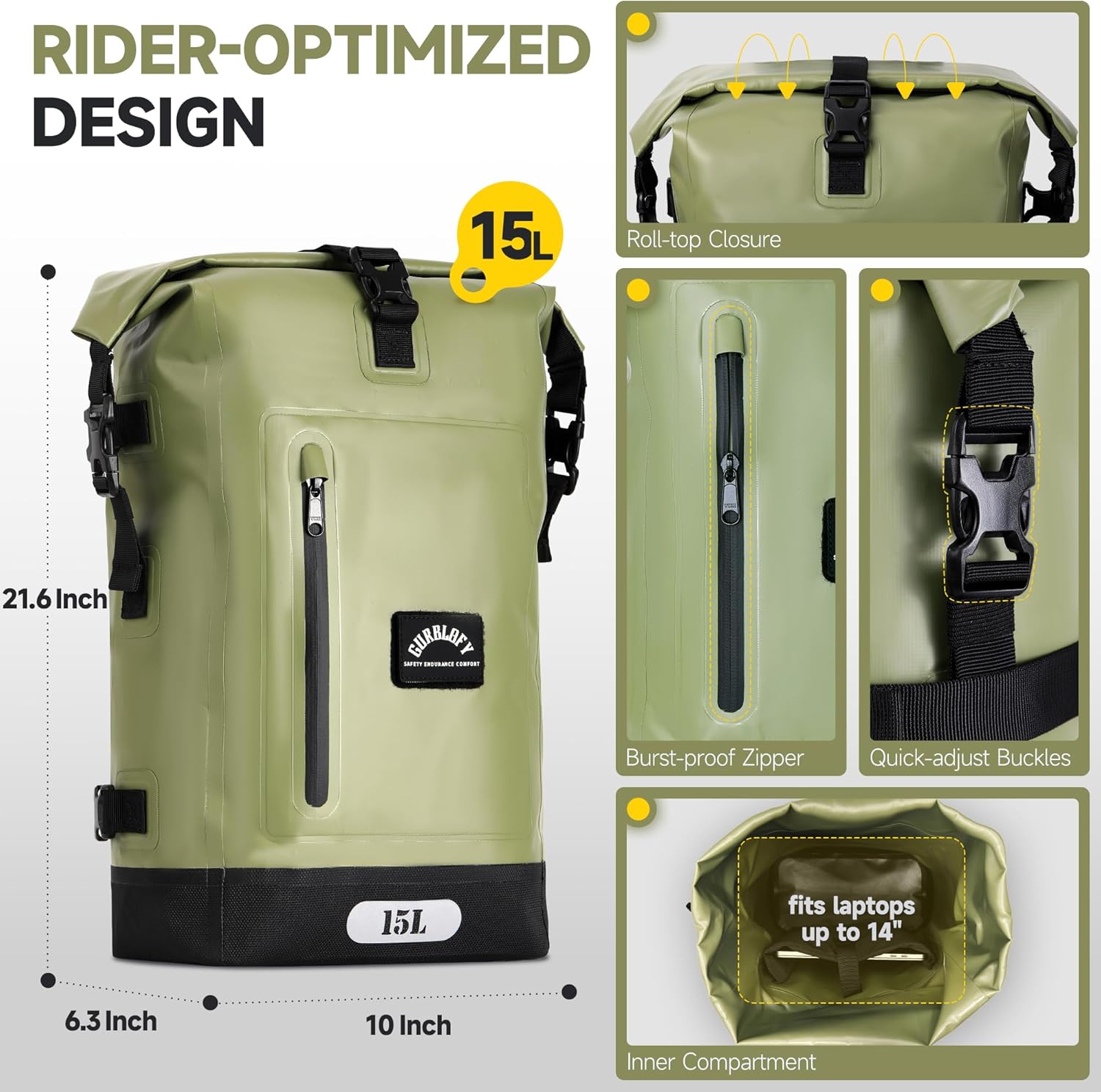 - Uniquely Engineered for Riders – Gurblofy’s Flagship Adventure Series. Engineered with heavy-duty PVC material for ultimate weather protection, this waterproof motorcycle bag combines rugged durability with sleek functionality. Available in two practical sizes - compact 15L (10×6.3×21.65 inches) for daily essentials or spacious 30L for extended adventures.Features three versatile color options: Classic Black, Field Green, and Stone Grey – blending durability with rugged aesthetics.