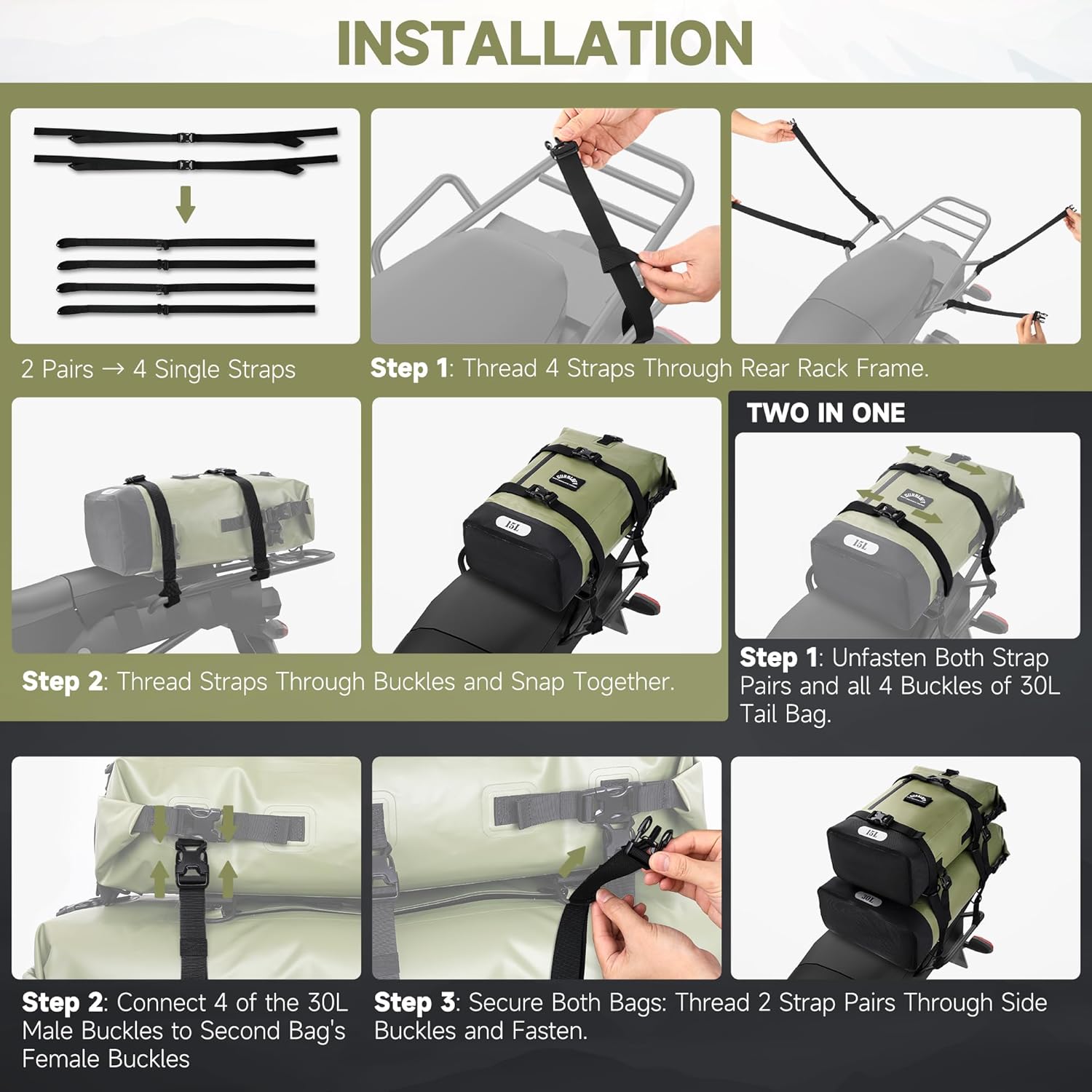 Motorcycle Saddle Bag, 15L Waterproof Motorcycle Tail Bag, 2 Size and 3 Color Options Travel Bag, PVC Bag, Rear Seat Bag, Backpack Field Green GT-15GN