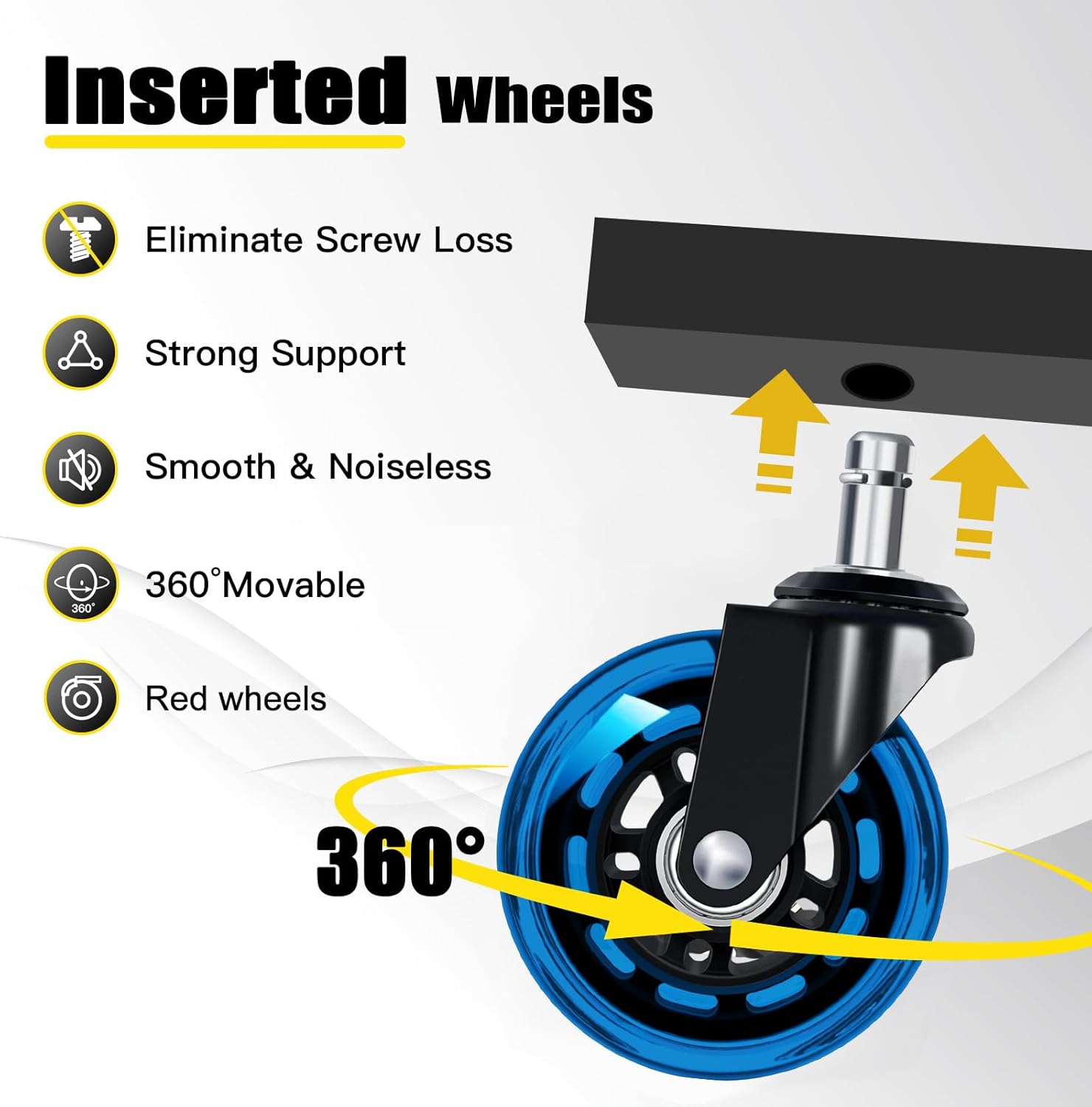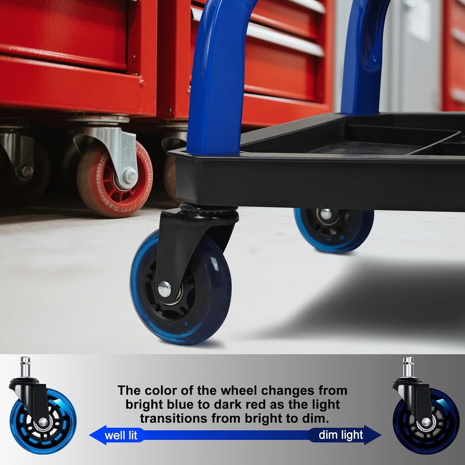 - The rolling shop stool is equipped with 4 pieces 360° swivel blue silent rubber wheels (without lockable brake). Like sapphire, the color of the wheel changes from dark blue to lake blue as the light transitions from dim to bright. 3 inch Smooth-rolling casters enhance mobility, easily over cracks and debris on floor