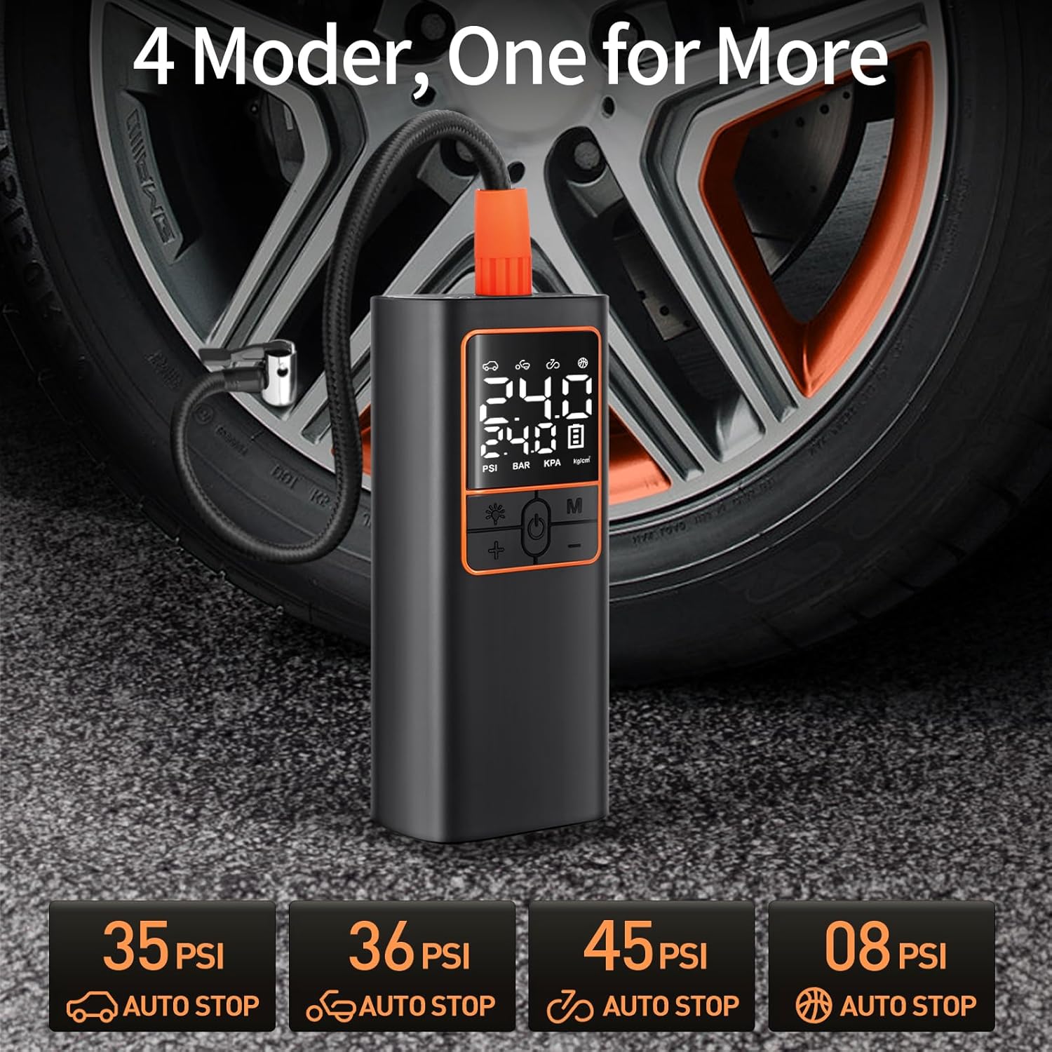 - 【Long Lasting Power Ttire Inflator】The all-in-one portable air compressor for car tires has a power bank that allows you to pump 7 vehicle tires, 20 motorcycles, 29 bicycles, 150 balls and other inflatables anywhere .
