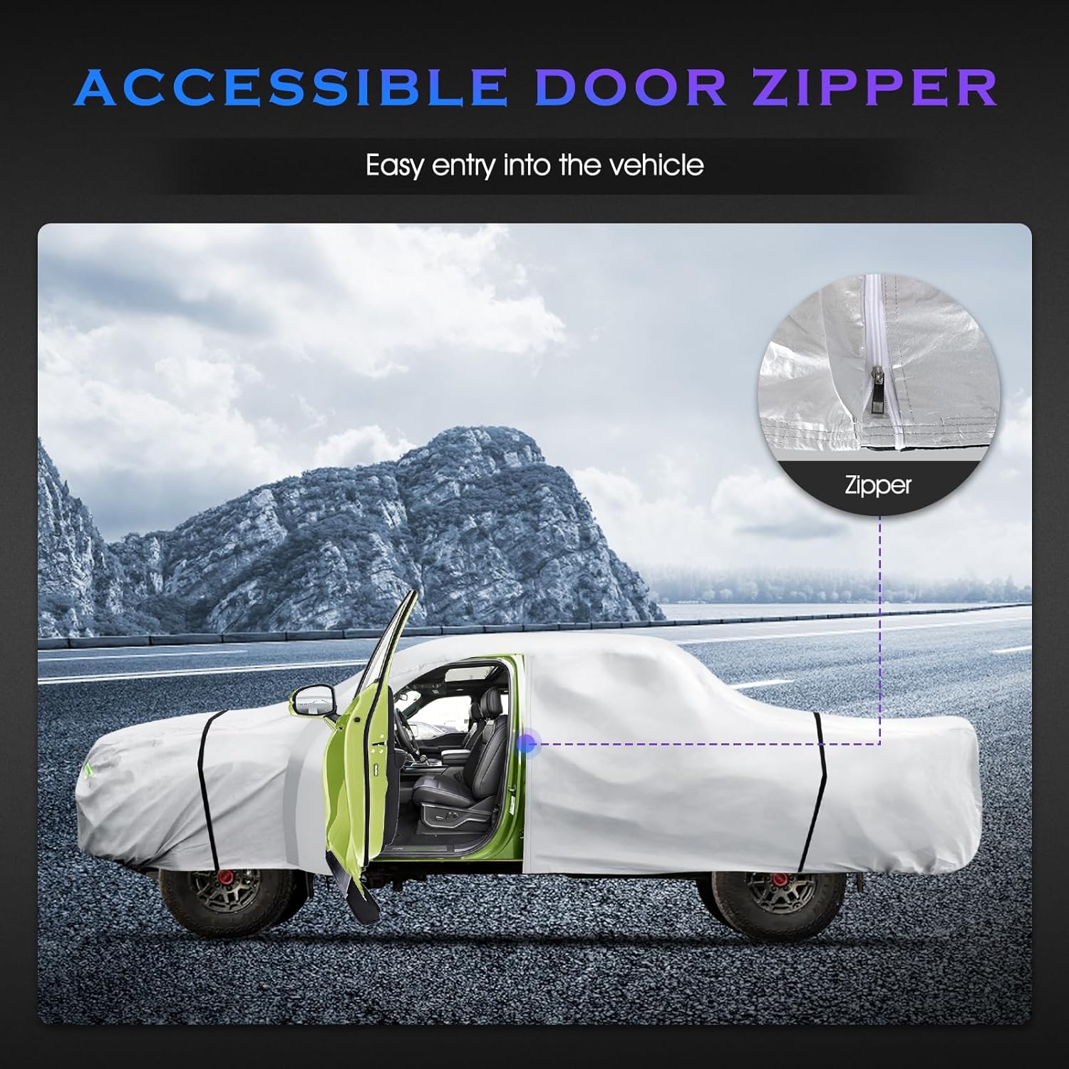- 【6 Layers Protection】: The Qualencey Truck cover features a multi-layer composite material design : PA Coating - PE - Aluminun - PE - PE - VA - Soft Cotton,which can withstands summer sun exposure and winter rain/snow;The streamlined design and superior craftsmanship protect your car's painting;For truck covers waterproof 4 doors are engineered to be Sturdy, colorfast, UV resistant, and water resistant to keep your car dry and warm in all seasons, for outdoor and indoor protection