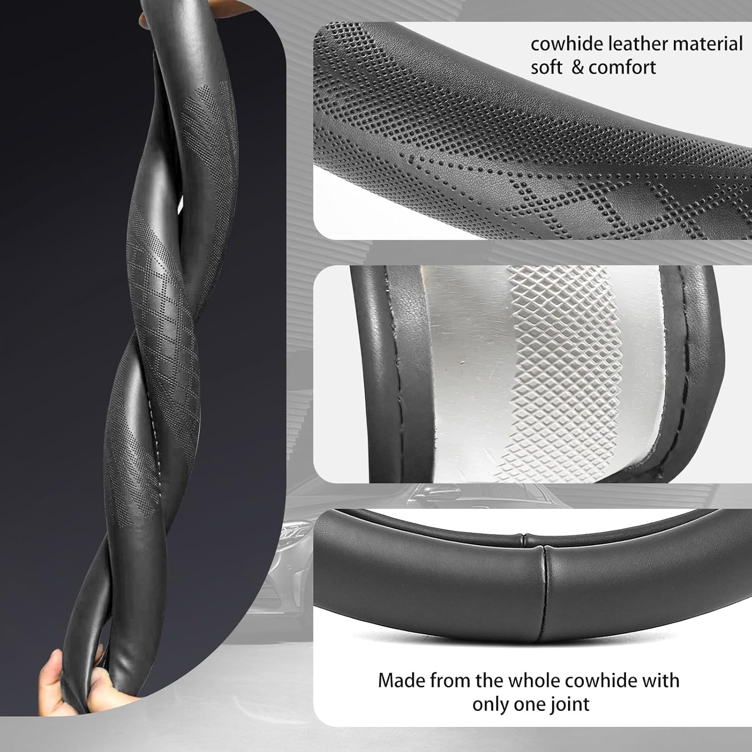 - Suitable Size】: Enhance the appearance and feel of your car's interior with our luxurious cowhide steering wheel cover. This steering wheel cover is designed to universally fit wheels ranging from 14.5 to 15 inches. Please measure the size of the steering wheel before purchasing.