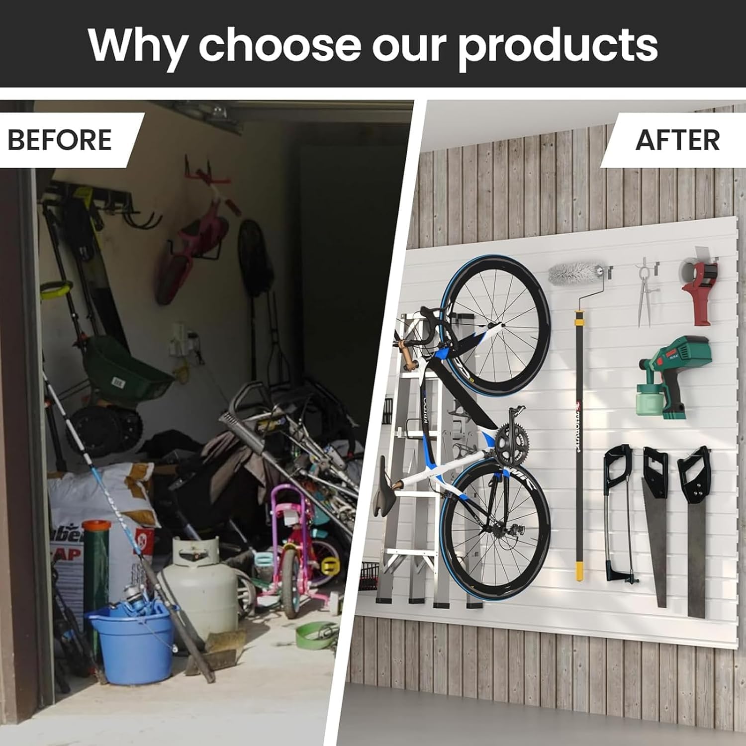 - Ladder & Bike Rack Storage Solution: The system includes eight 4ft x 1ft slat wall panels, covering 32 square feet. You can mix and match these panels to customize your setup. For additional storage, you can expand by adding more panels to accommodate your evolving storage needs, giving you the flexibility to craft the perfect configuration.