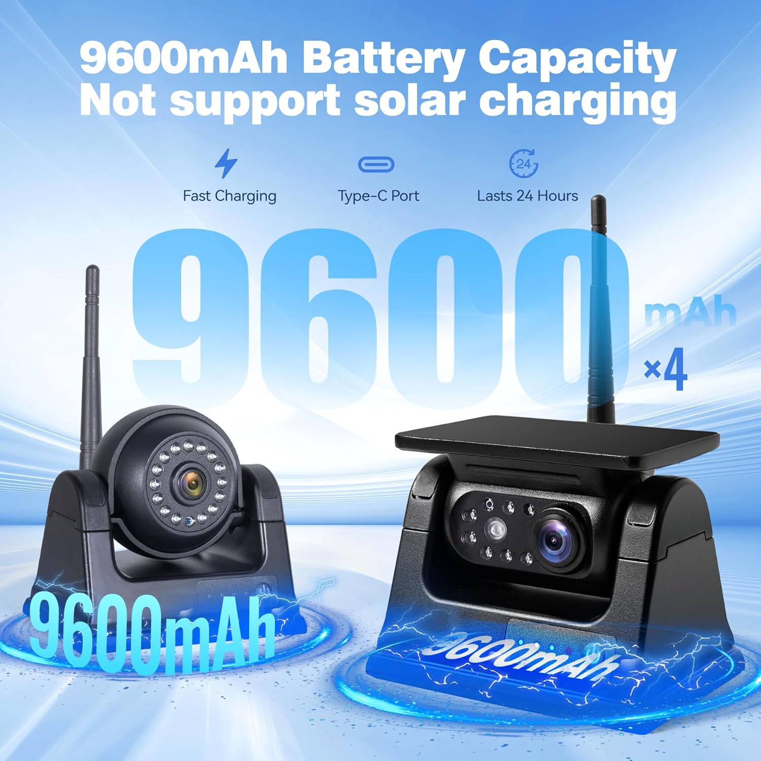 - 【Complete 4-Camera Kit for 360° Visibility】 Never miss a spot with our easy-to-use wireless camera set (2 rear + 2 side cameras). Enjoy worry-free power all day with huge 9600mAh batteries that charge fast using the included 4 premium adapters (Type-C cables in box). The super-strong magnets hold tight on any vehicle, yet pop off easily when you need to move them. Perfect for trucks, RVs, trailers - installs in minutes with zero wiring!