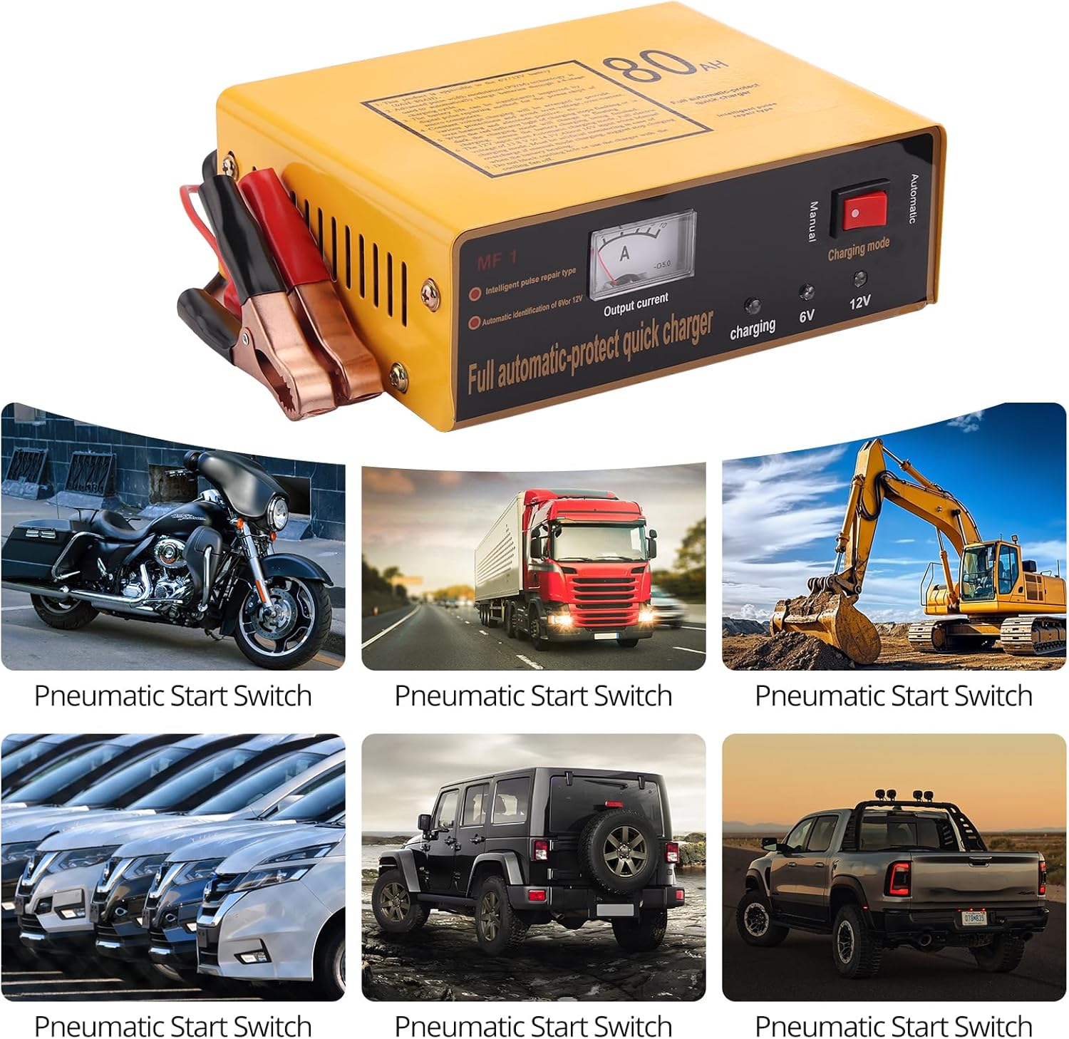 - 【6V/12V Car Battery Charger】6V/12V battery charger effortlessly charge and maintain all types of lead-acid automotive, marine, deep-cycle, flooded, gel, AGM, maintenance-free, WET, CAL, EFB with battery capacity 6Ah-200Ah on cars motorcycles Truck Boat Toy Car Lawn Mower>>It is not a jump starter,avoid using the charger on completely dead or frozen batteries