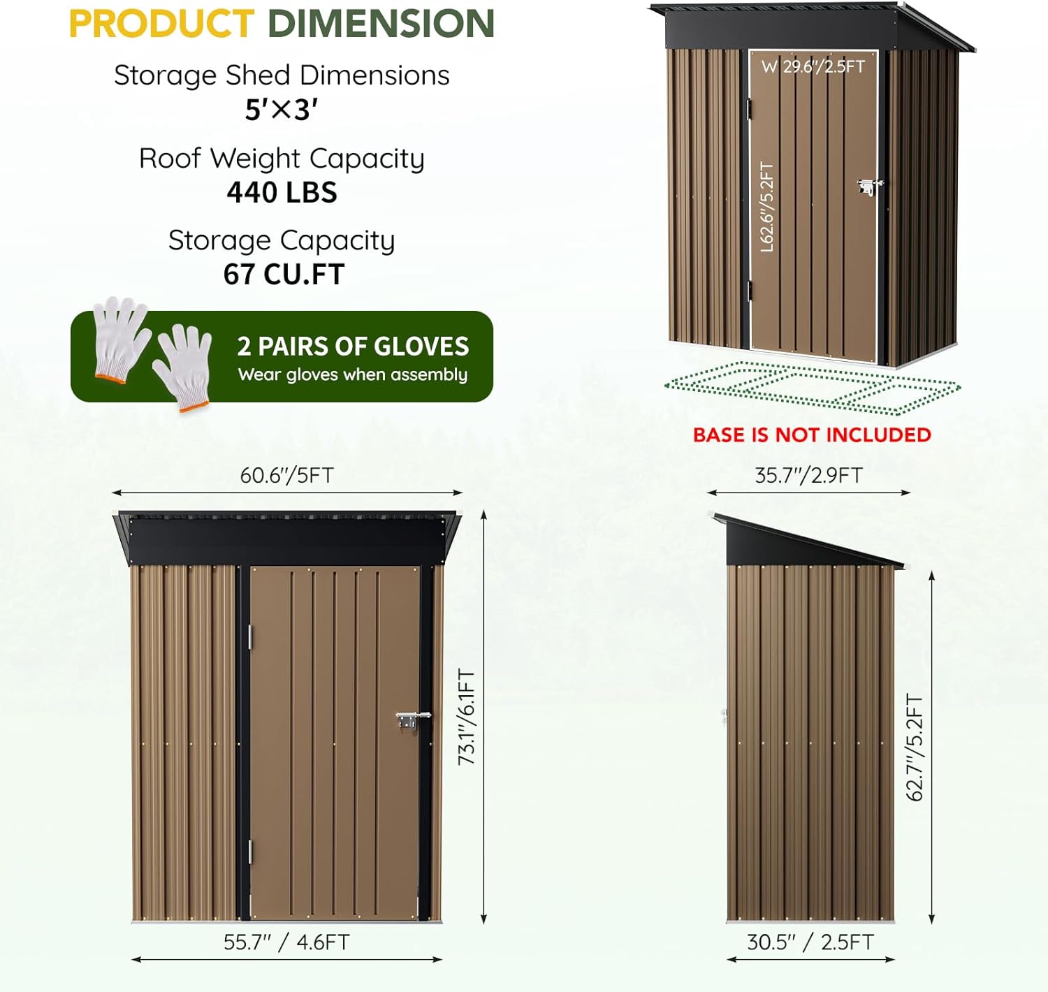 5x3FT Vertical Outdoor Steel Storage Shed, Lockable Doors, Compact Metal Tool Shed for Garden, Backyard, Patio, Utility, and Bike Storage,Brown