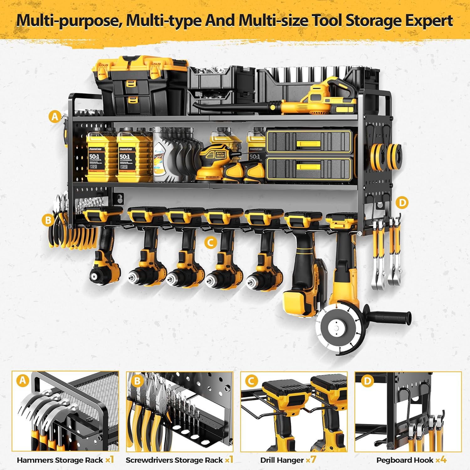 - 【Stronger Weight Capacity】This tool storage rack for garage organization is made of thickened heavy-duty steel metal for greater weight capacity and durability. We also used stronger and longer expansion screws, and the other screws were also larger, making the tool rack hang more securely on the wall and the drill storage wall mount more sturdy.