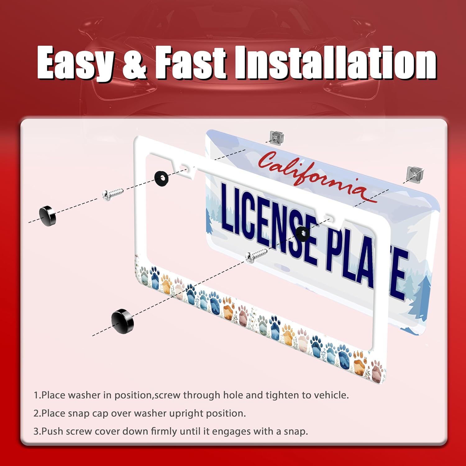 - With Accessories: 2 screws, 2 screw caps, 2 washers. Easy to install, can be easily installed, 1 set of 1 can be installed on the front license plate or rear license plate.