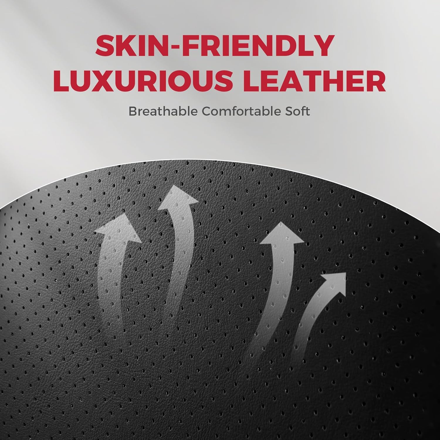 - [Premium Faux Leather] Made of high-grade perforated faux leather, these covers are breathable waterproof, easy to clean, and a luxurious. Whether you frequently engage in outdoor activities, travel with kids, or have pets, maintaining the elegance and sophistication of your car interior is effortless