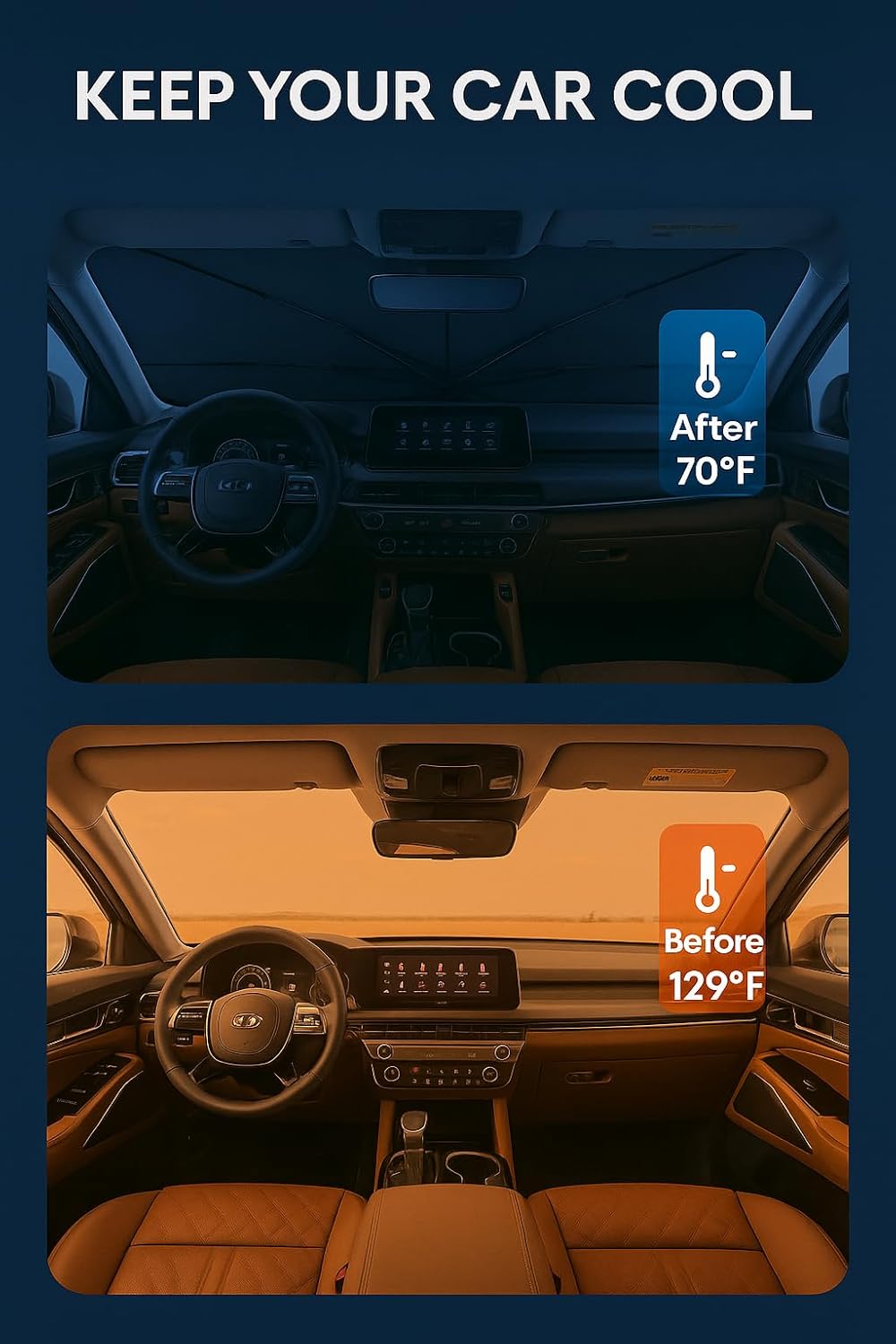 - Innovative Ice Crystal Material: The sunshade adopts a 4-layer design, which is thick enough to effectively block and reflect sunlight. After multiple uses, it is still strong and not easy to tear. The sunshade also uses innovative ice crystal materials to evenly distribute heat, quickly cool down, and keep your car cool all the time. You no longer have to worry about getting your seat or car handle scalded by high temperatures.