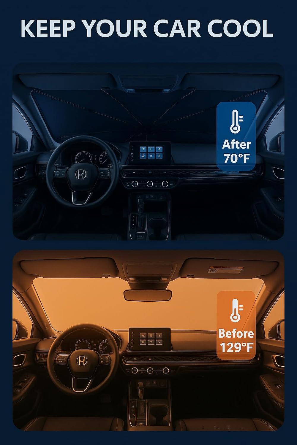 - Certified Sustainable. Customized Windshield Sunshade: Specially designed for the 2023-2025 Honda CRV with precise mirror cutouts, providing 100% shading, carbon fiber handle, ensuring lightweight and durability while also having a fashionable feel. Our CRV windshield sunshade can protect the interior of your car from various light damage and prevent dashboard and seat degradation.