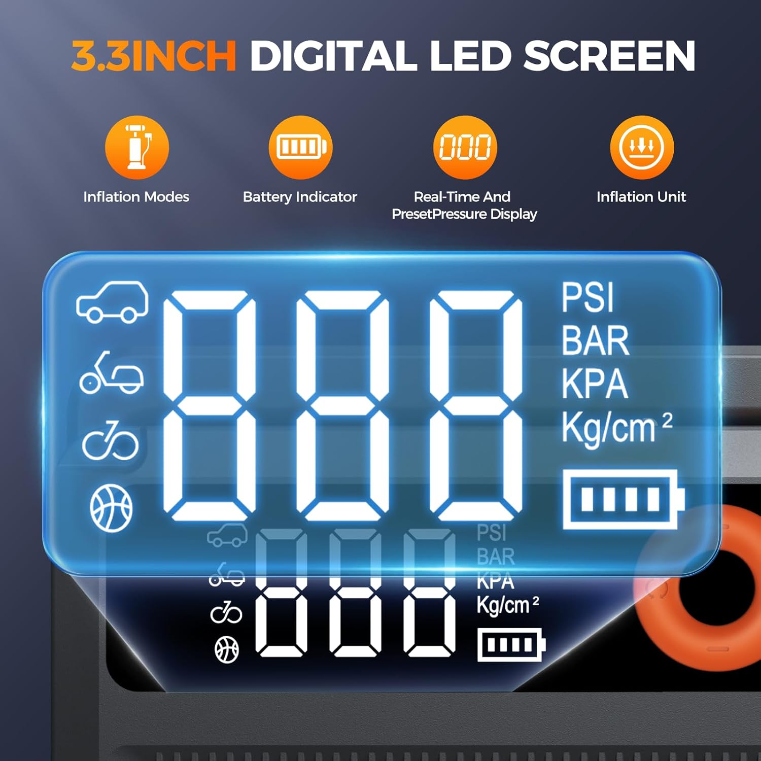 - ă150 PSI Air Compressor & 3.3'' LCD DisplayăThe VX5 portable jump starter with air compressor fill a flat car tire to 30 PSI in just 2 minsâfaster than most jump starter! Includes 3 nozzles, 4 selectable units (PSI, BAR, kPa, kg/cm²), 4+N inflation modes, and a 45cm air hose for cars, motorcycles, bikes, balls, etc. The 3.3-inch sunlight-readable LCD display real-time pressure, while 150 PSI presets, integrated sensors, and auto-shutoff ensure accurate inflation and prevent over-inflation!