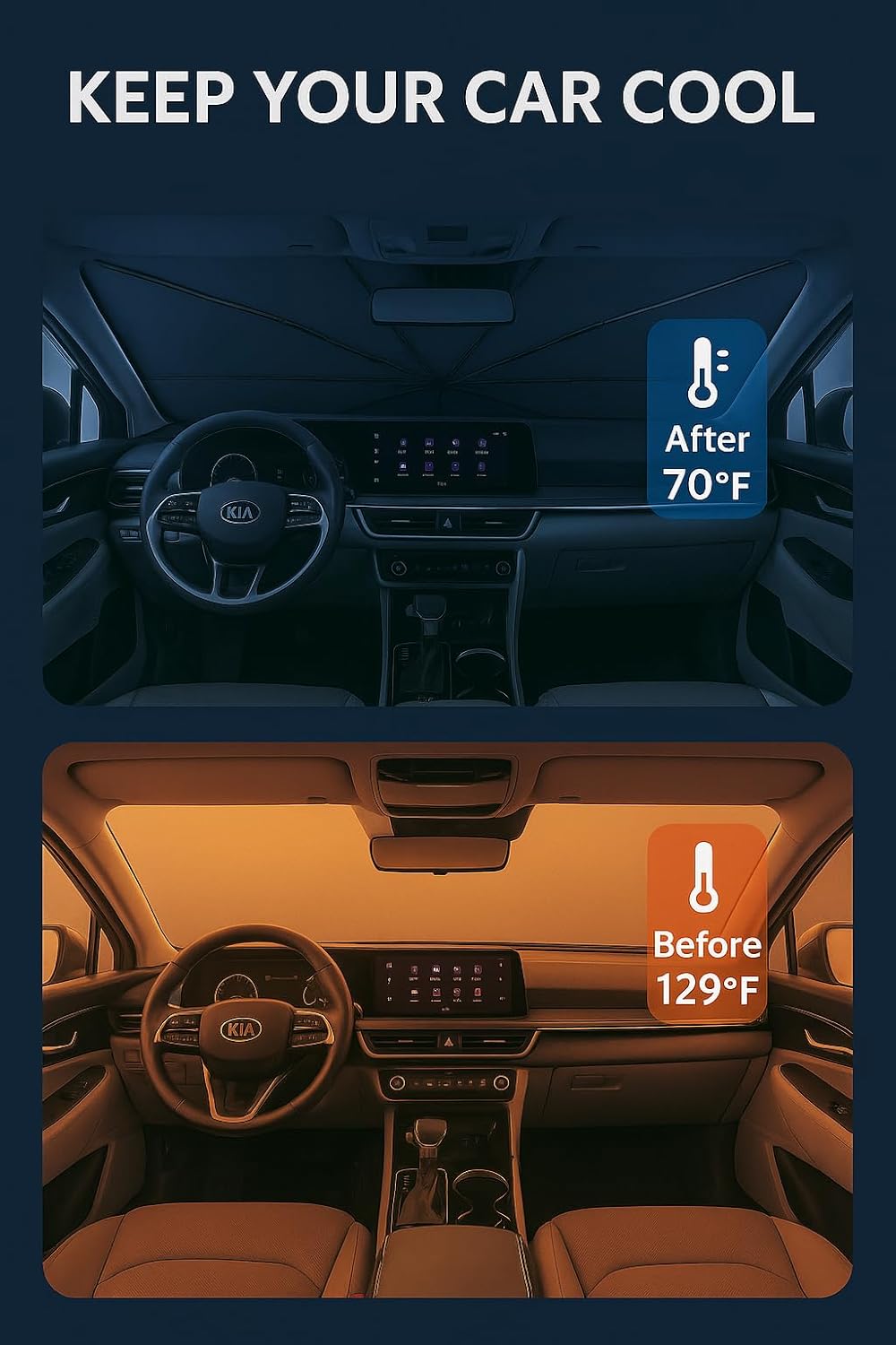 - Innovative Ice Crystal Material: The sunshade adopts a 4-layer design, which is thick enough to effectively block and reflect sunlight. After multiple uses, it is still strong and not easy to tear. The sunshade also uses innovative ice crystal materials to evenly distribute heat, quickly cool down, and keep your car cool all the time. You no longer have to worry about getting your seat or car handle scalded by high temperatures.