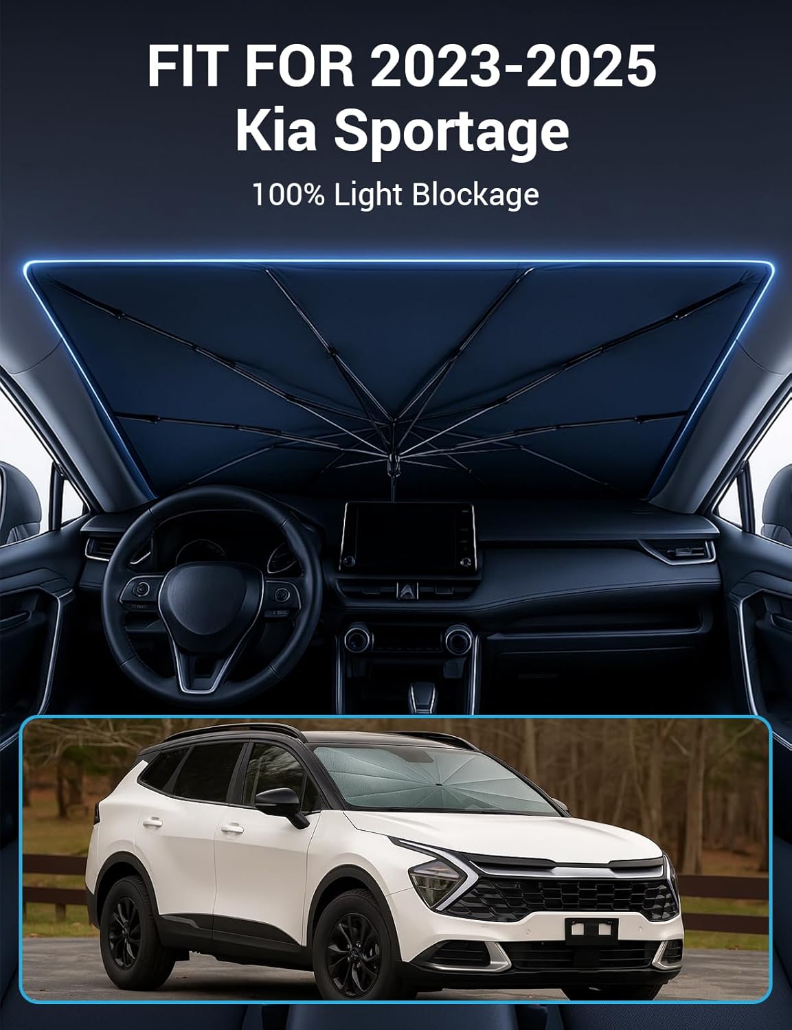 - Certified Sustainable. Customized Windshield Sunshade: Specially designed for the 2023-2025 Kia Sportage NQ5 with precise mirror cutouts, providing 100% shading, carbon fiber handle, ensuring lightweight and durability while also having a fashionable feel. Our Sportage NQ5 windshield sunshade can protect the interior of your car from various light damage and prevent dashboard and seat degradation.