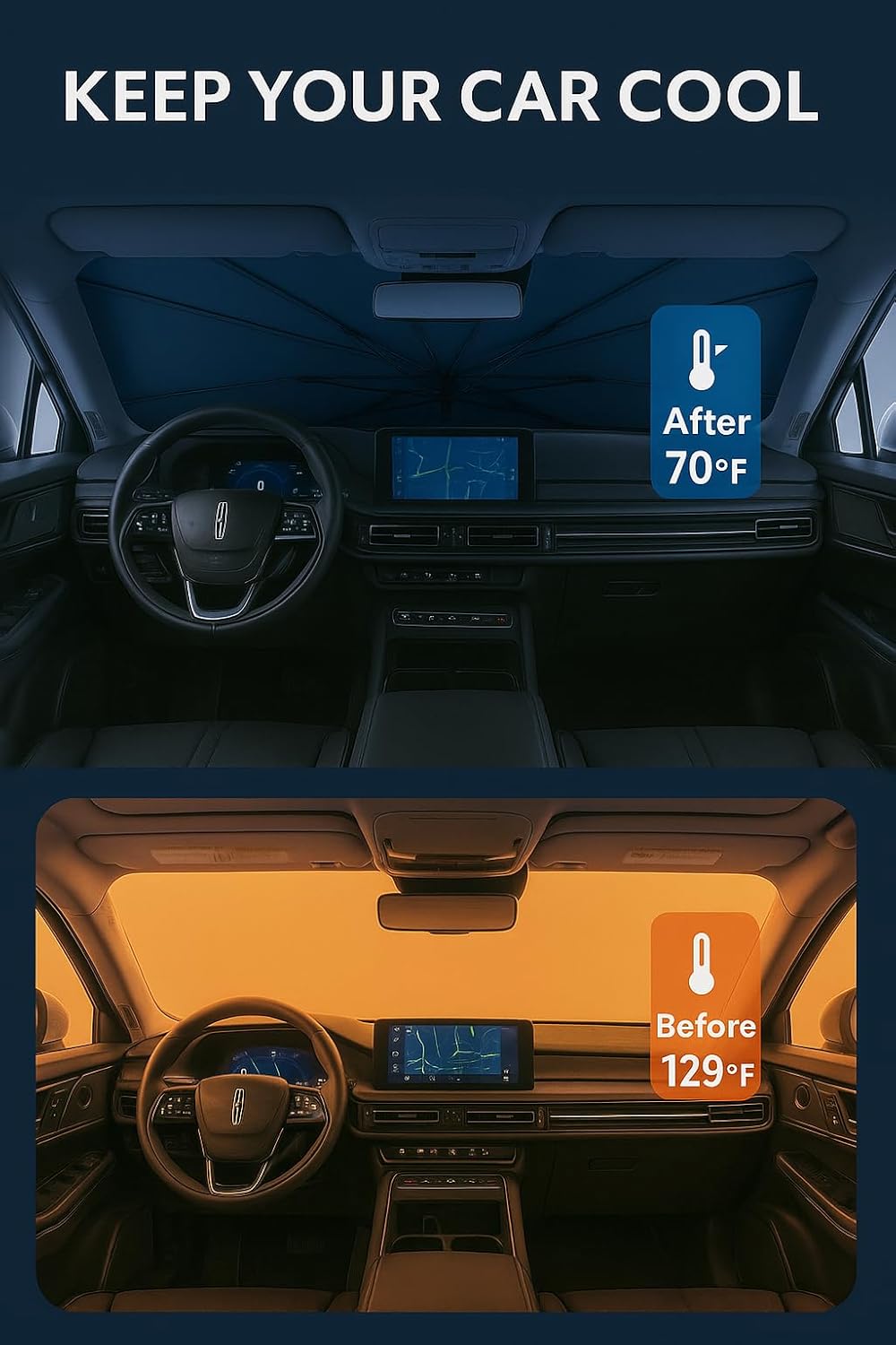 - Certified Sustainable. Customized Windshield Sunshade: Specially designed for the 2020-2025 Lincoln Aviator with precise mirror cutouts, providing 100% shading, carbon fiber handle, ensuring lightweight and durability while also having a fashionable feel. Our Aviator windshield sunshade can protect the interior of your car from various light damage and prevent dashboard and seat degradation.