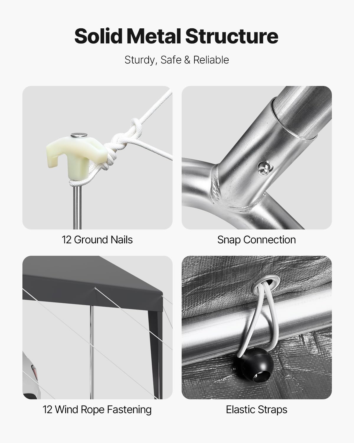 - Strong and Durable Materials: Constructed with galvanized steel pipes to prevent rust, the alloy steel frame is stronger and more durable than regular steel, able to withstand higher wind pressure and heavier weight, ensuring the carport remains stable and long-lasting. Equipped with wind ropes and ground stakes for added security in windy conditions.