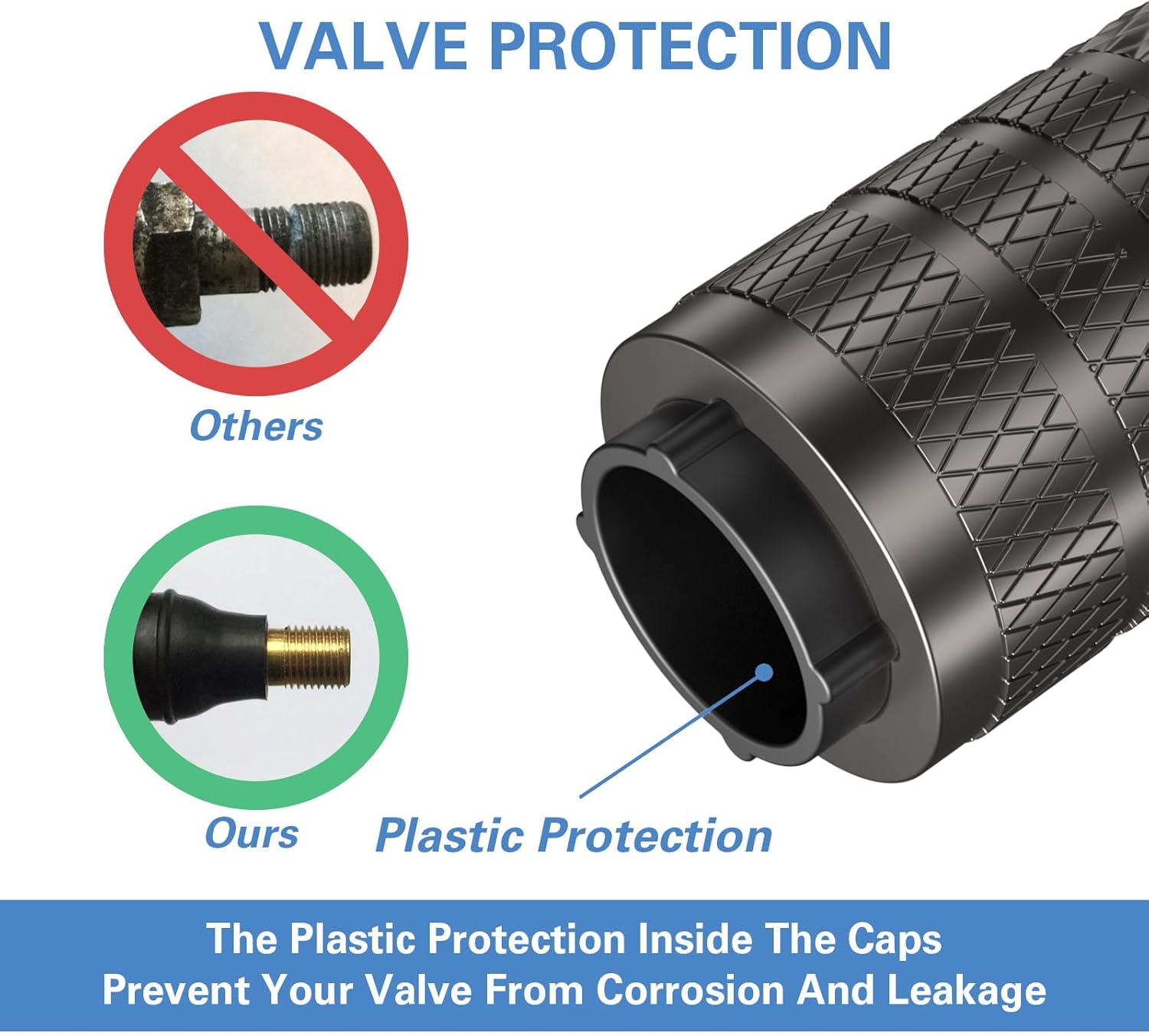 - Special Design β Metal materials are prone to rust in the presence of water and oxygen, which may lead to corrosion on valve body. The plastic inner valve caps design combines the attribution of corrosion resistance of plastic and the stylish look of metal.