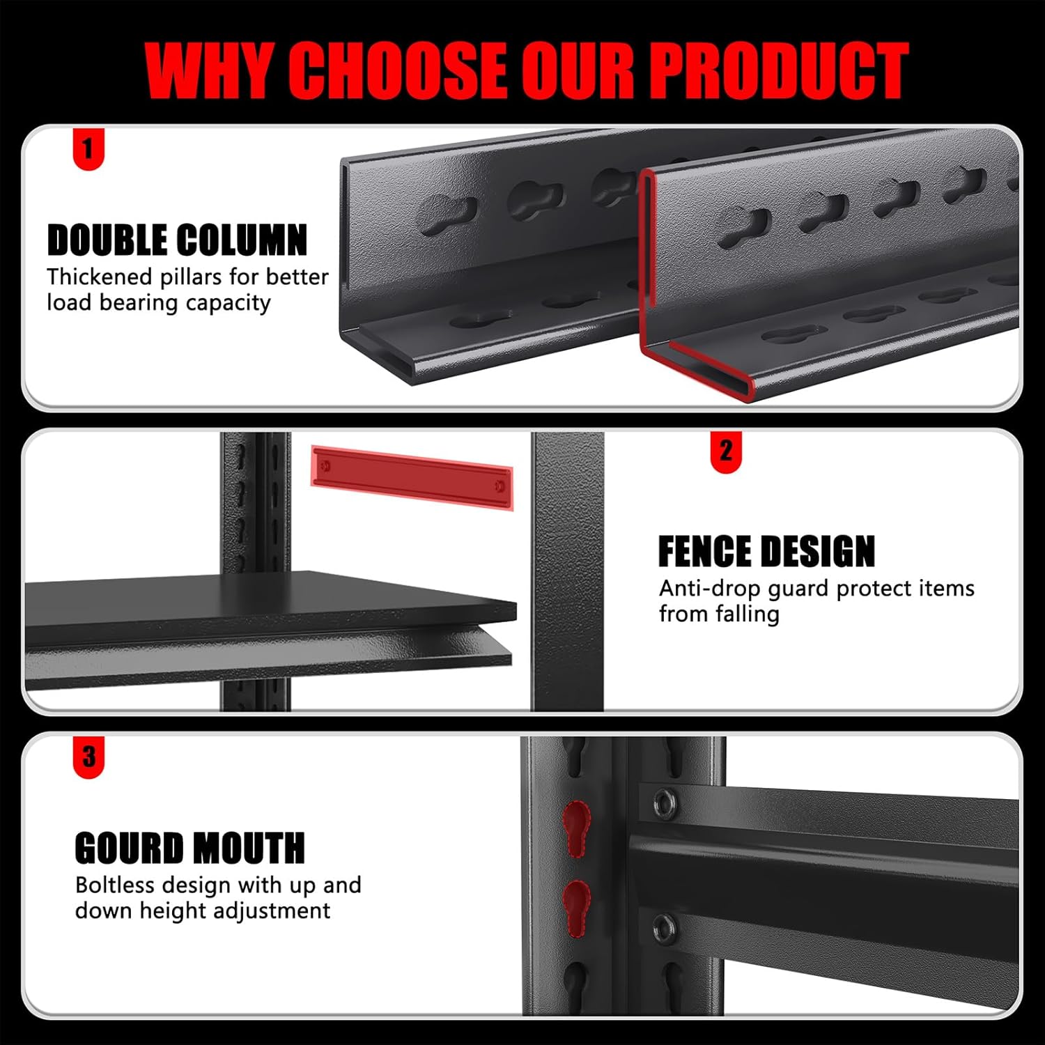 - ăExtremely Sturdy & Durable Garage ShelvingăConstructed from high-strength premium cold-rolled steel with advanced powder-coated technology, this metal garage shelving unit resists rust, oxidation, and wear. The industrial-grade coating not only enhances aesthetics but also boosts durability, making it a heavy-duty shelving solution for long-term use