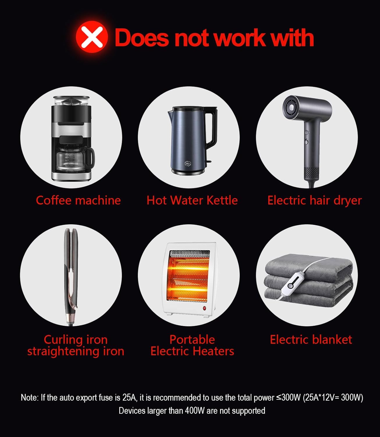 - 【Essential for Road Trips】The car power inverters for vehicles is the perfect choice for outdoor travel and camping. It provides stable power output for devices such as smartphones, tablets, laptops, and cameras. Additionally, it serves as an emergency backup power source for household appliances like lights and fans. Regardless of the travel scenario, this car inverter can meet diverse power needs and plays an indispensable role in enhancing the outdoor travel experience.