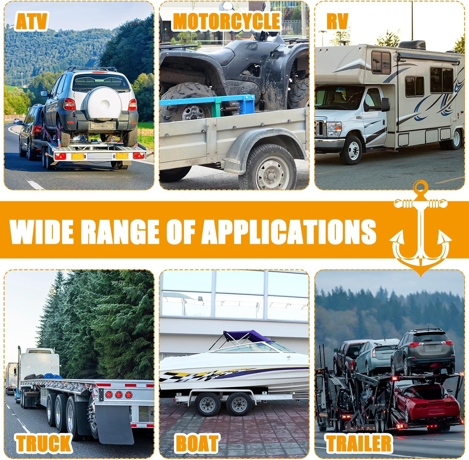 - Wide Applicability: made to fit a variety of situations; Whether you're towing a car, truck, sedan, coupes, sport, ATV, UTV, or a boat, these straps will serve you well; These straps for trailer's size and strength make them ideally suited for both recreational and commercial use