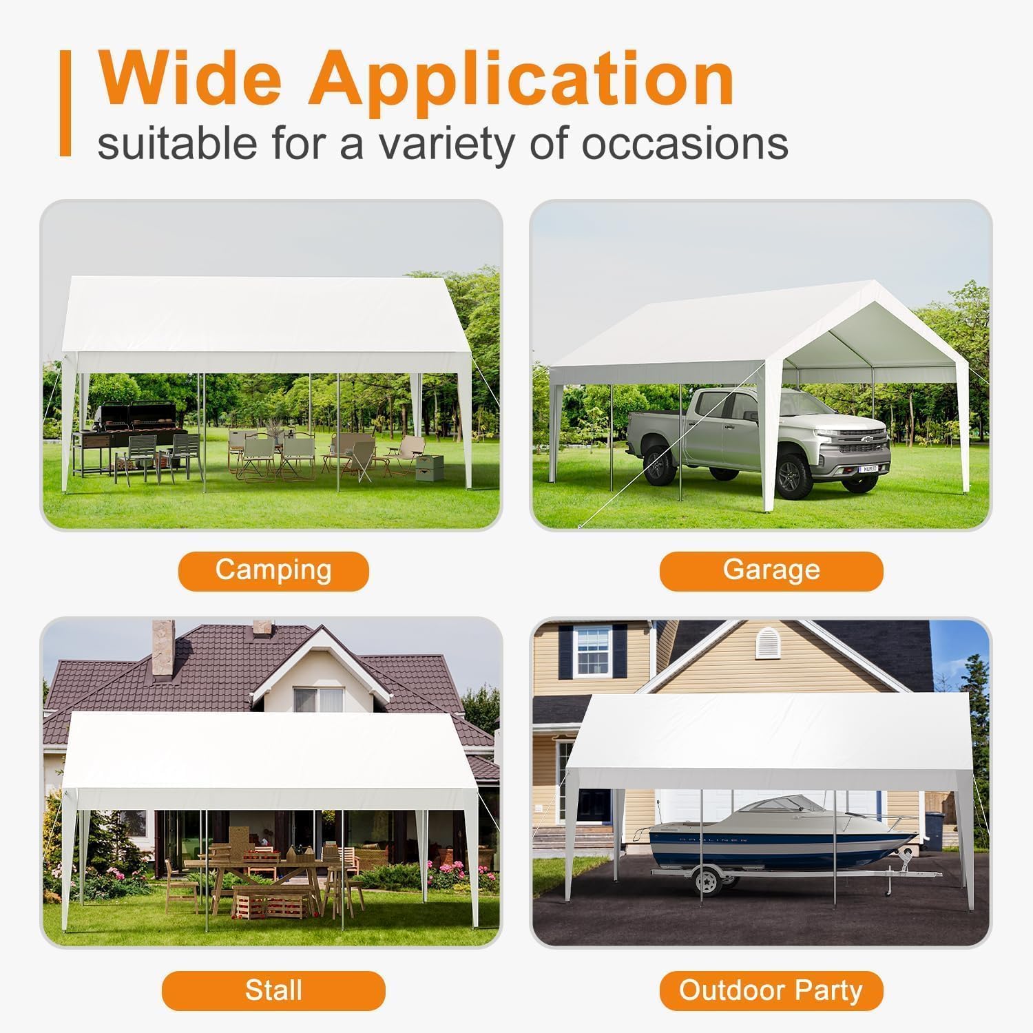 - [Versatile Applications]Whether you need a portable carport for your RV, a gathering space for social events, or a commercial shelter for business shows, this heavy-duty carport meets all your needs. Its spacious design and robust construction make it perfect for various outdoor activities, providing a reliable solution for storage and entertainment. Experience the convenience and versatility this carport brings to your outdoor lifestyle.