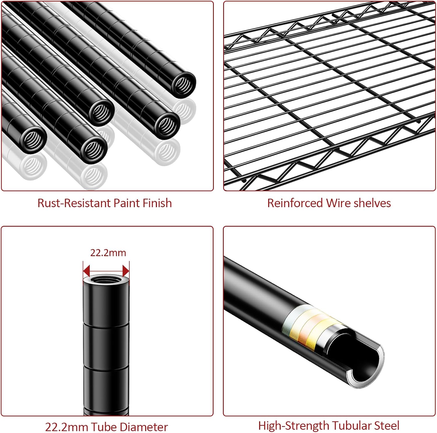 - ăStable & Durable â Built to Hold Heavy LoadsăConstructed from high-quality carbon steel and reinforced with 22.22mm thick support pipes, this IZEUK shelving unit (17.7"D x 47.2"W x 76.7"H) offers exceptional stability and strength. Each shelf holds up to 350 lbs, with a total capacity of 1750 lbs on leveling feet or 600 lbs on wheelsâperfect for heavy-duty storage needs.