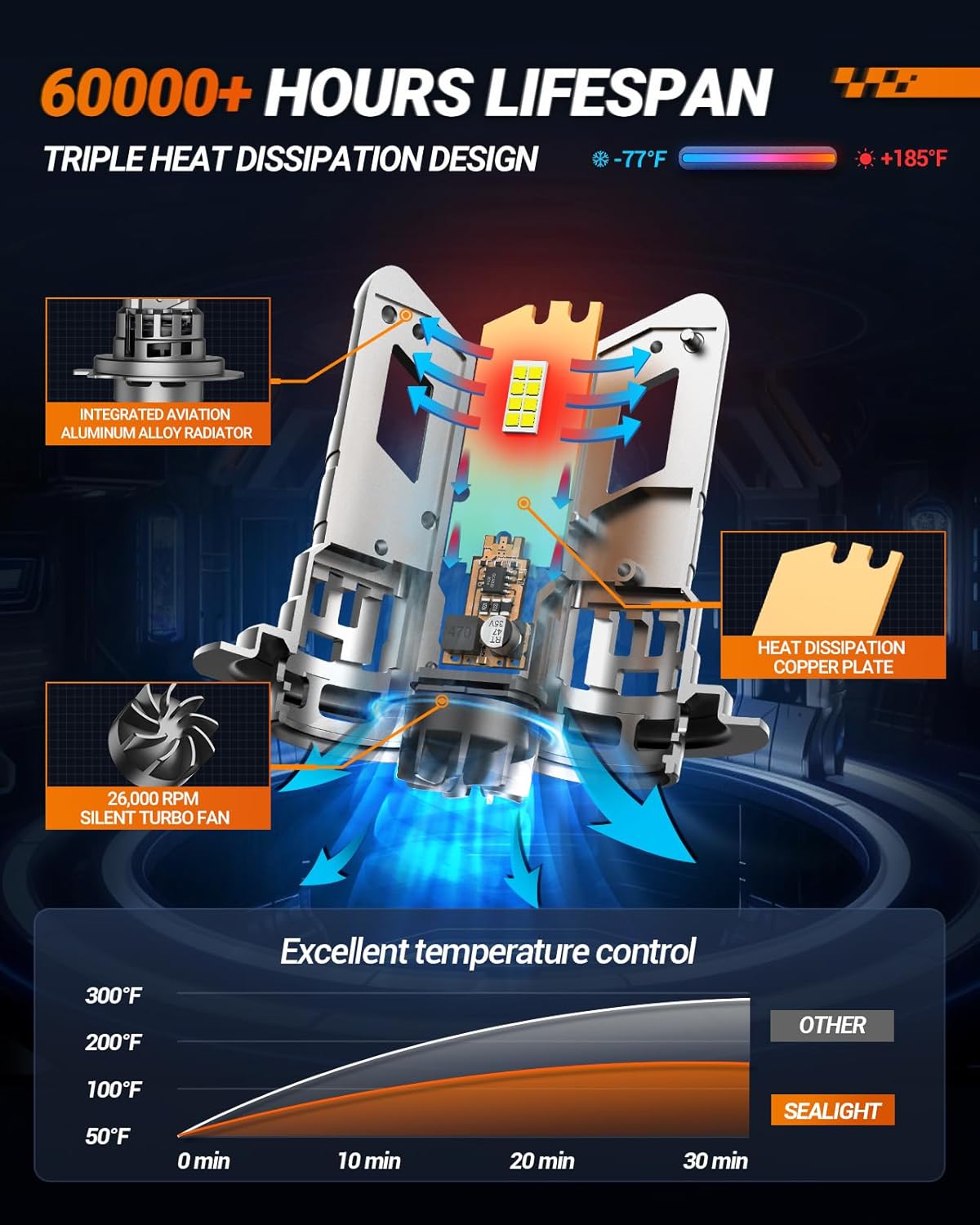 - 【60000+ Hours Lifespan】Equipped with a 13000RPM high-speed cooling fan, the H7 Fog Bulbs offer exceptional heat dissipation, providing over 60000 hours of reliable illumination and smooth operation. In addition, IP67 waterproof technology can make it use in a variety of weather