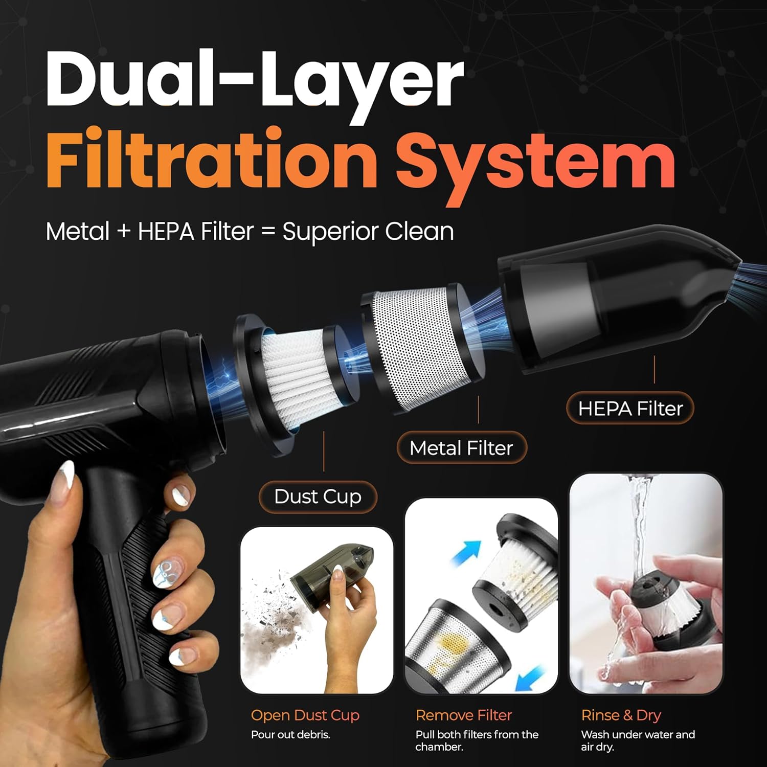 - Durable & Easy to Maintain โ Designed with a washable HEPA filter, this portable vacuum for car ensures efficient filtering & long-lasting performance. One-touch dust disposal makes cleaning easy