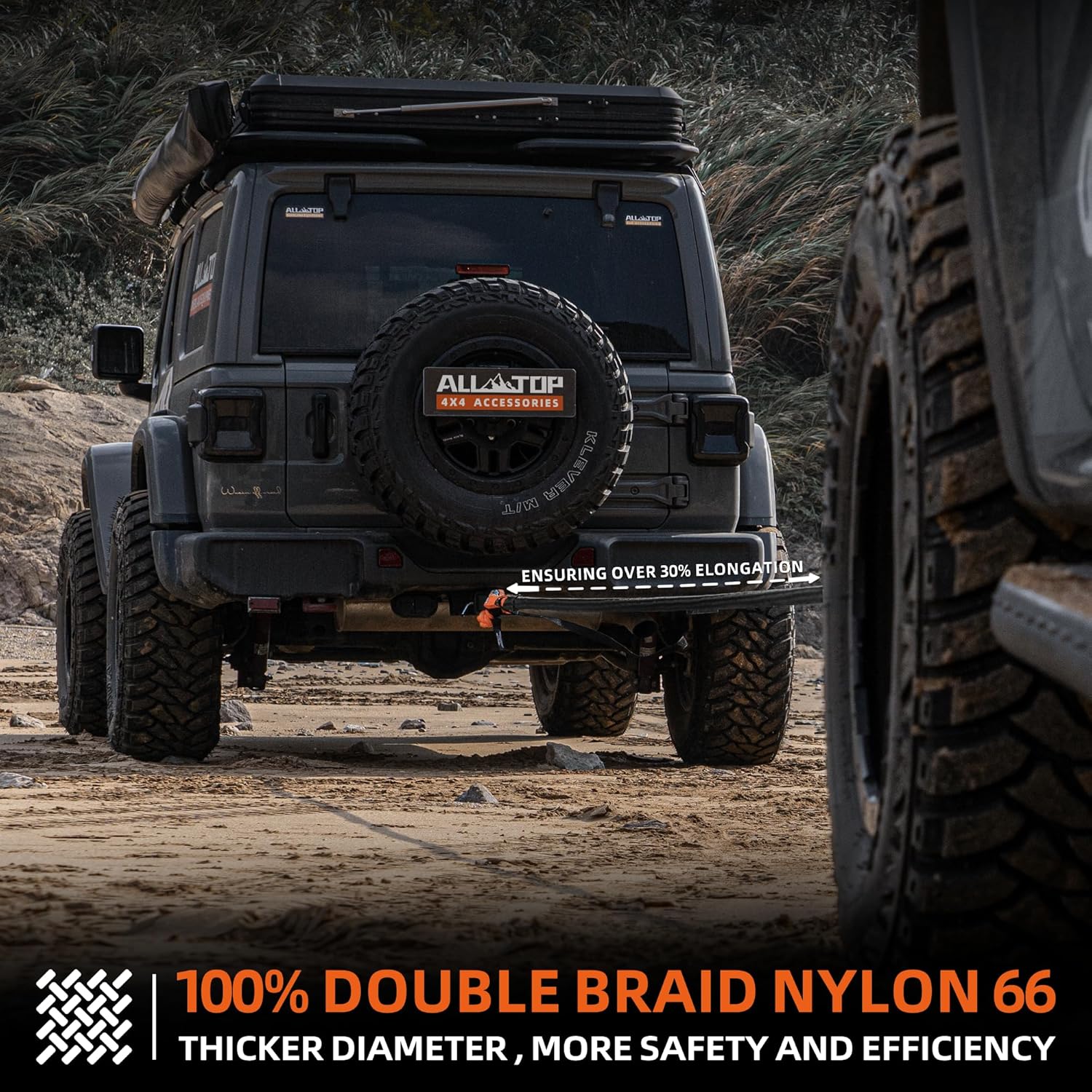 - 【RECOVERY MUST-HAVE】 ALL-TOP Kinetic Rope is one of the most reliable overlanding gear you should have to safeguard your exploring trips. Double braided with 100% Nylon N66 and coated with Mil-spec Polymers, provides a trustable 83000Lbs Break Strength Rating and 27600Lbs Work Load Limit.