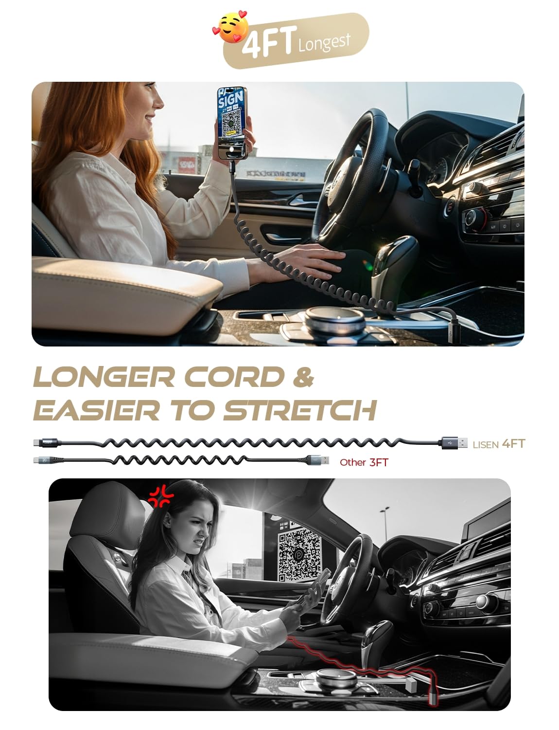 - 【Coil Freedom 1-4ft】LISEN USB C cable features a 1ft natural length extending to 4ft max, delivering optimal comfort at 2-3ft. Crafted from full 1.5m straight cable coiling to true 1.2m, unlike imitations using 1m material that shrinks to just 0.7m, it enables smooth navigation, calls and code scanning in your car for tug-free and snag-free use