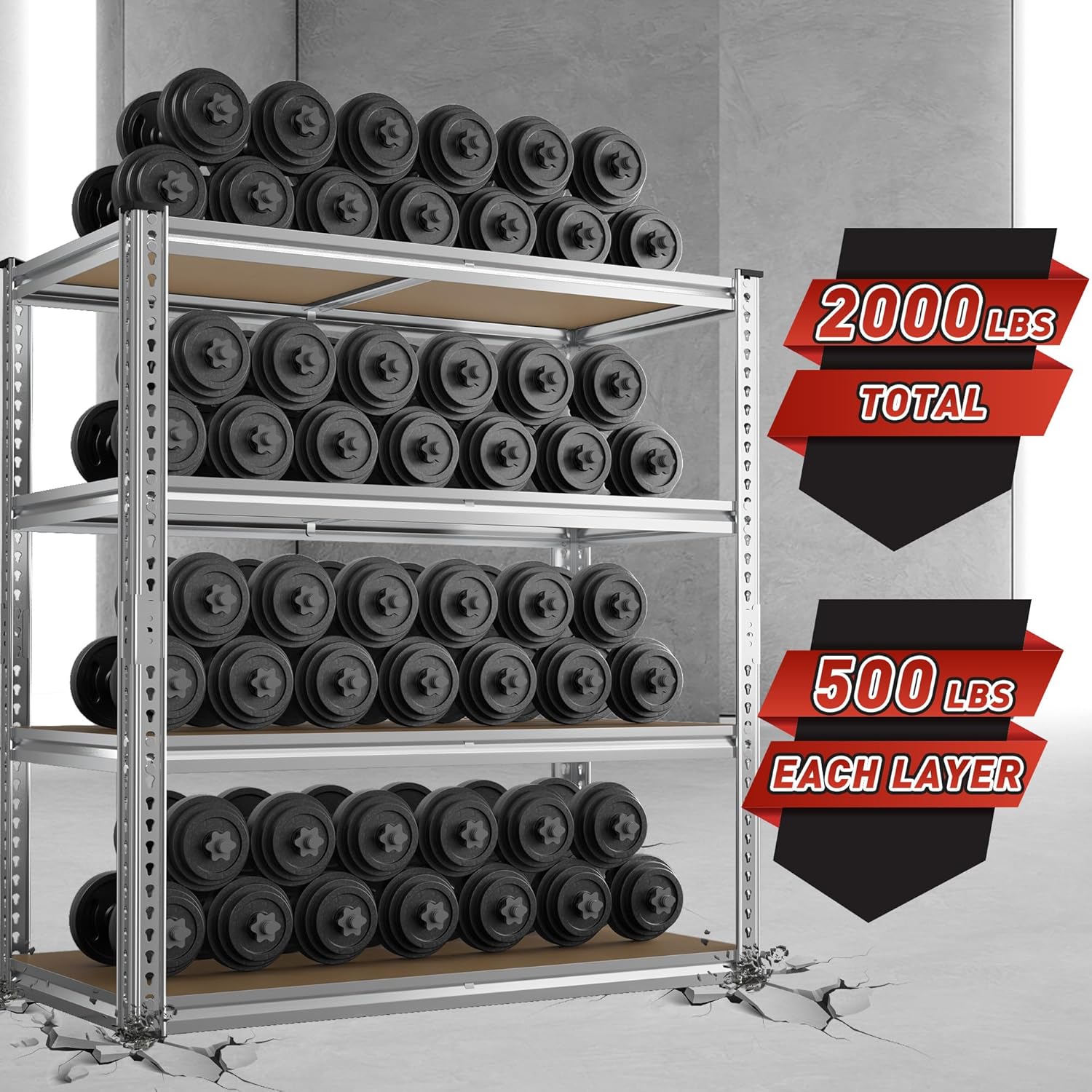 - ă2000LBS Capacity Storage ShelvesăThe heavy duty shelving has thickened metal frame, rolled edge and 5mm wood board,each metal shelves with big ribs beneath can hold up to 500 lbs, with a total bearing capacity of 2000 lbs, which makes garage shelves more sturdy and more stuff can be stored