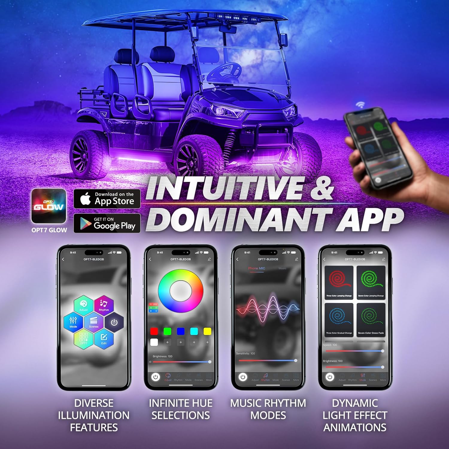 - Custom Glow for Every Vibe: Whether you're cruising through beach towns, rolling into a lakeside festival, or gliding through a gated community, your lighting can match the moment. With a quick swipe on the OPT7 GLOW App, explore an endless range of color modes and vibrant effects. Sync with your favorite playlists and light up your golf cart for a captivating experience! The app supports iOS 7+ and Android 4.3+, ensuring seamless customization. Scan the QR code on the package to unlock these versatile features.