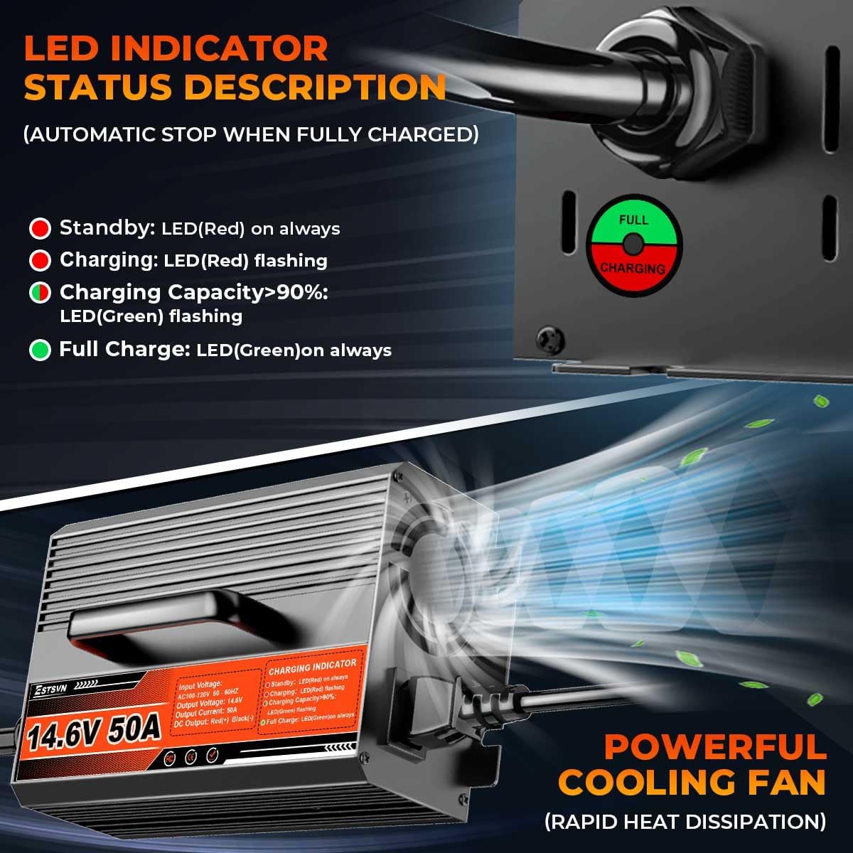50A 14.6V LiFePO4 Battery Charger 12V Lithium Battery Smart Charger Fast Charging with Anderson Connector AC-DC Trickle Charger for Deep Cycle Rechargeable Batteries of RV Boat Car Marine