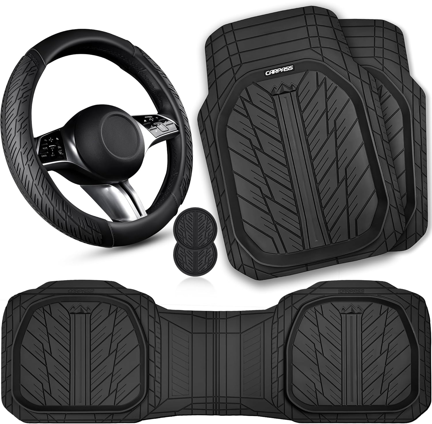 CAR PASS Leather Rubber Steering Wheel Cover 14 1/2” -15”,Tire Tread Pattern Design,Non-Slip Wear-Resistant, Heavy Duty Deep-Dish Car Floor Mats, Trim-to-Fit Car Mat,Fit for Steering Wheel Black