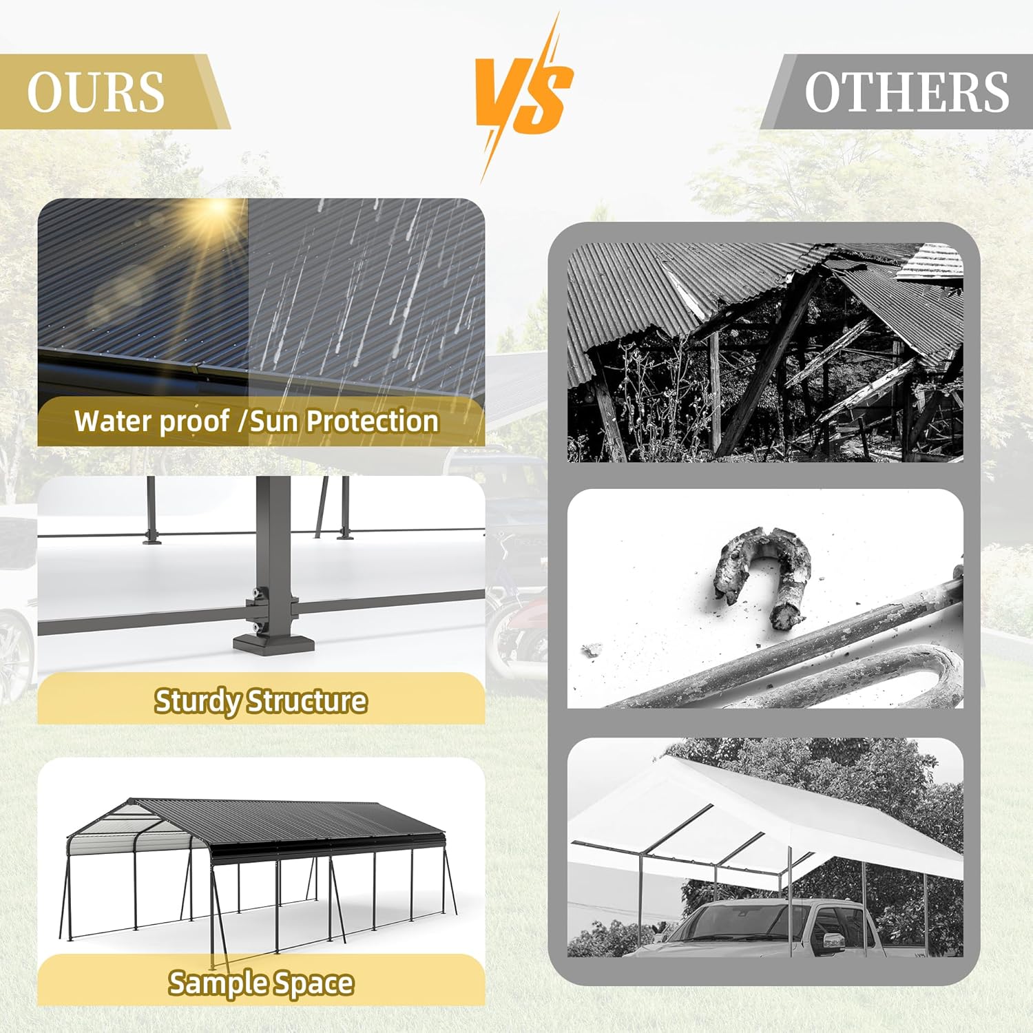 - โ ๐๐ฅ๐ฅโ๐๐๐๐ญ๐ก๐๐ซ ๐๐๐ซ๐ฉ๐จ๐ซ๐ญ: Sized at 13 ร 26.5 ft, this metal carport provides year-round protection for your car, boat, and outdoor gear against wind, rain, and snow. Protruding eaves combined with rainproof tape seal out leaks during heavy downpours. Say goodbye to parking headaches under reliable, all-season heavy duty car ports.