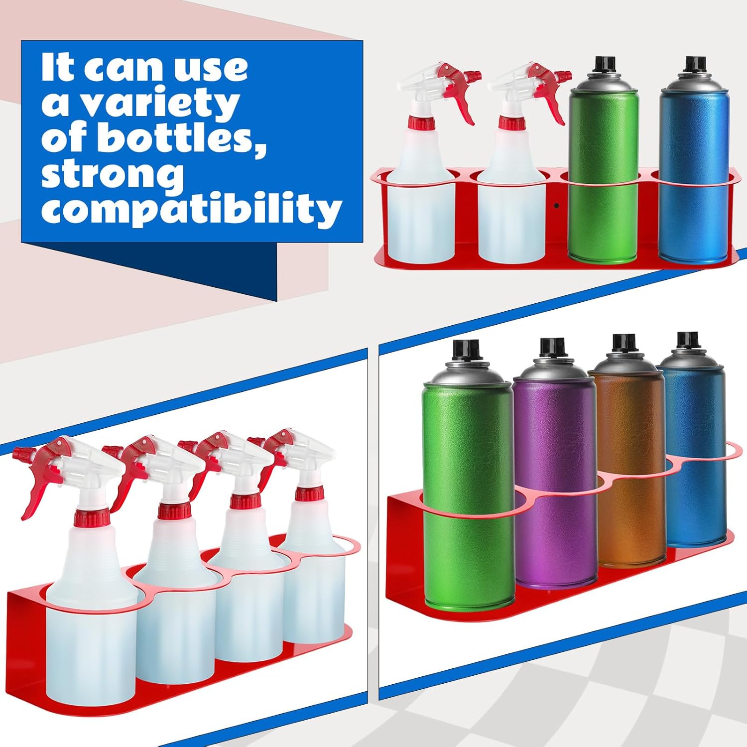 - Efficient and space-saving: The spray bottle organizer measures approximately 16 X 4 x 3.6 inches and is designed to effectively save space in garages, workplaces, and homes. Its compact design allows for the storage of up to 4 bottles while taking up minimal space, making it a great choice for those who wish to organize their work areas