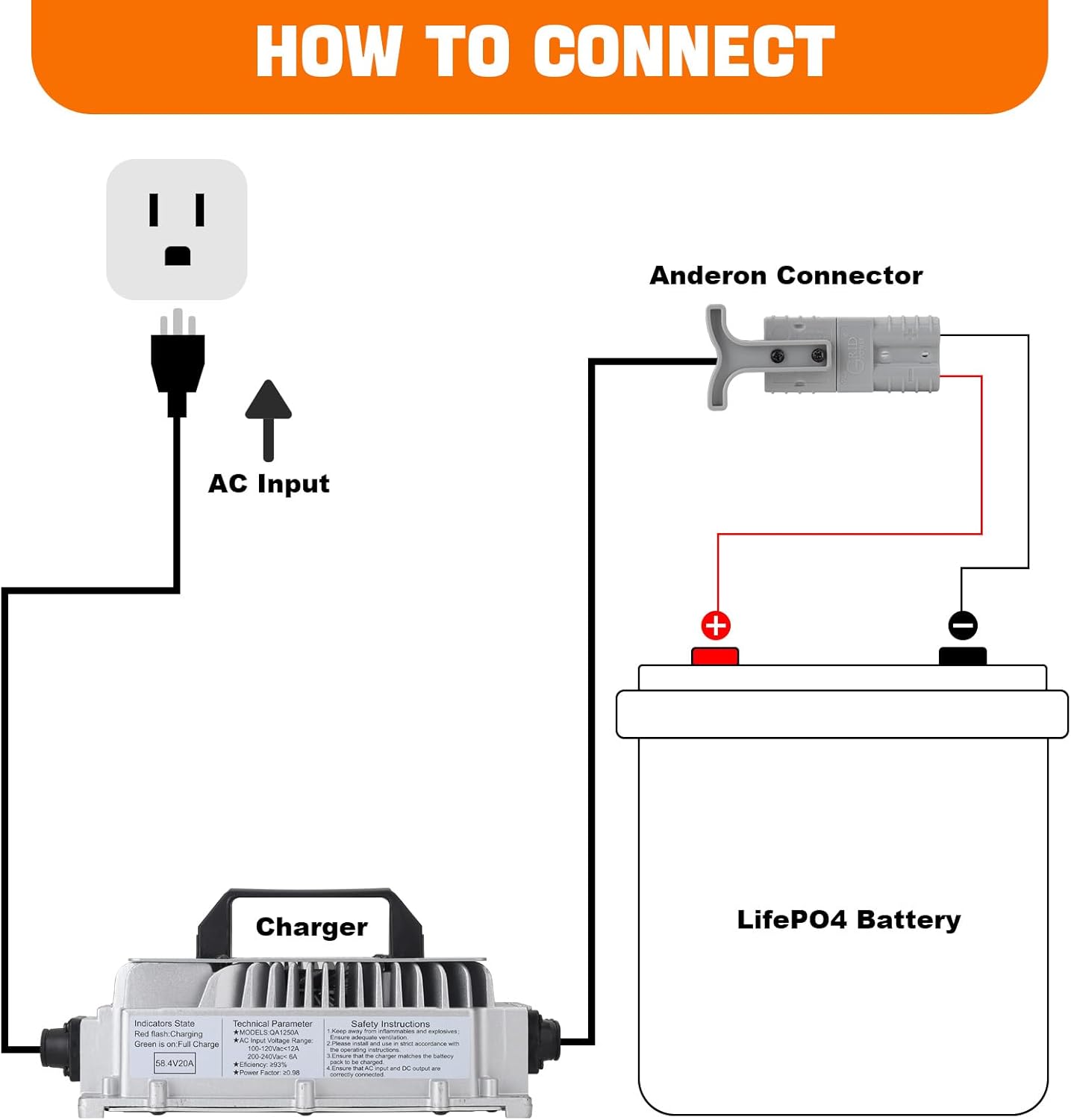 - 【Easy Operation】58.4V 20A lithium battery charger upgraded the connection between the charger and the battery with an M8 terminal and alligator clips, and added a Anderson connector for customer convenience. We have kept the cooling fan to enable the charger to charge more efficiently.