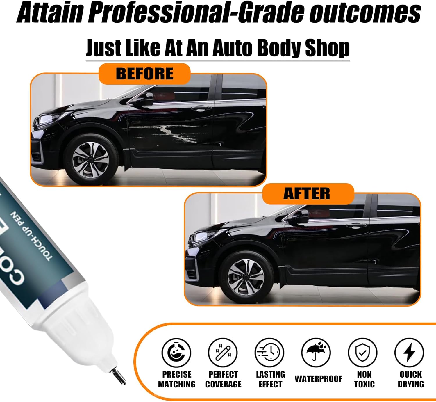 - ăRepair scratches quickly and simplyăThis car scratch repair paint has strong adhesion, anti-rust, and waterproof properties that protect your car's surface from further damage. With a 2-in-1 uses design, each bottle of car paint comes with a pen pin and brush, ensuring a hassle-free application