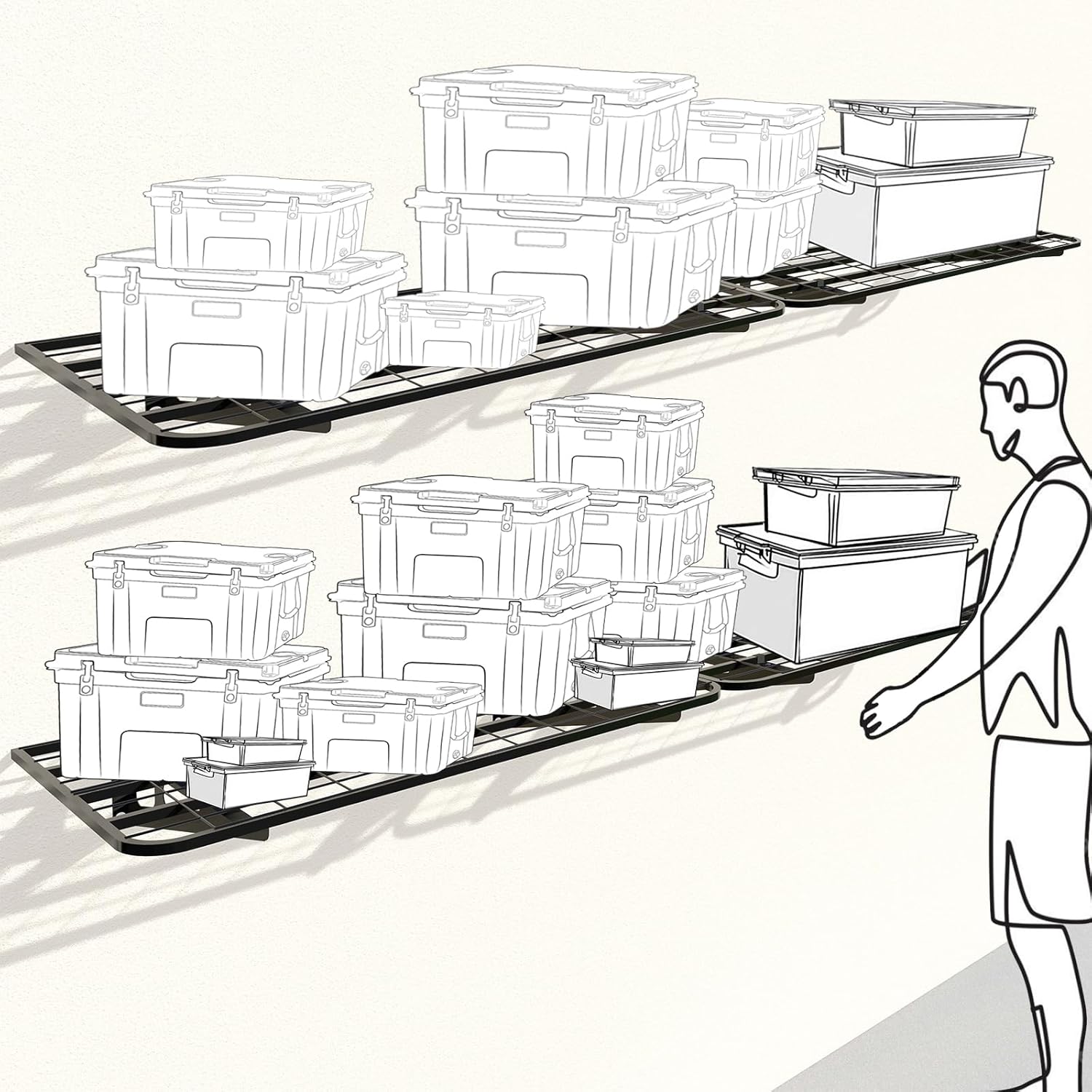 - ăGarage Shelvingă: Includes a 4-pack of wall mounted garage shelves, each measuring 24 x 48'IN, perfect for holding storage bins, boxes, sporting goods, tools, and more. say goodbye to cluttered garage space storage.