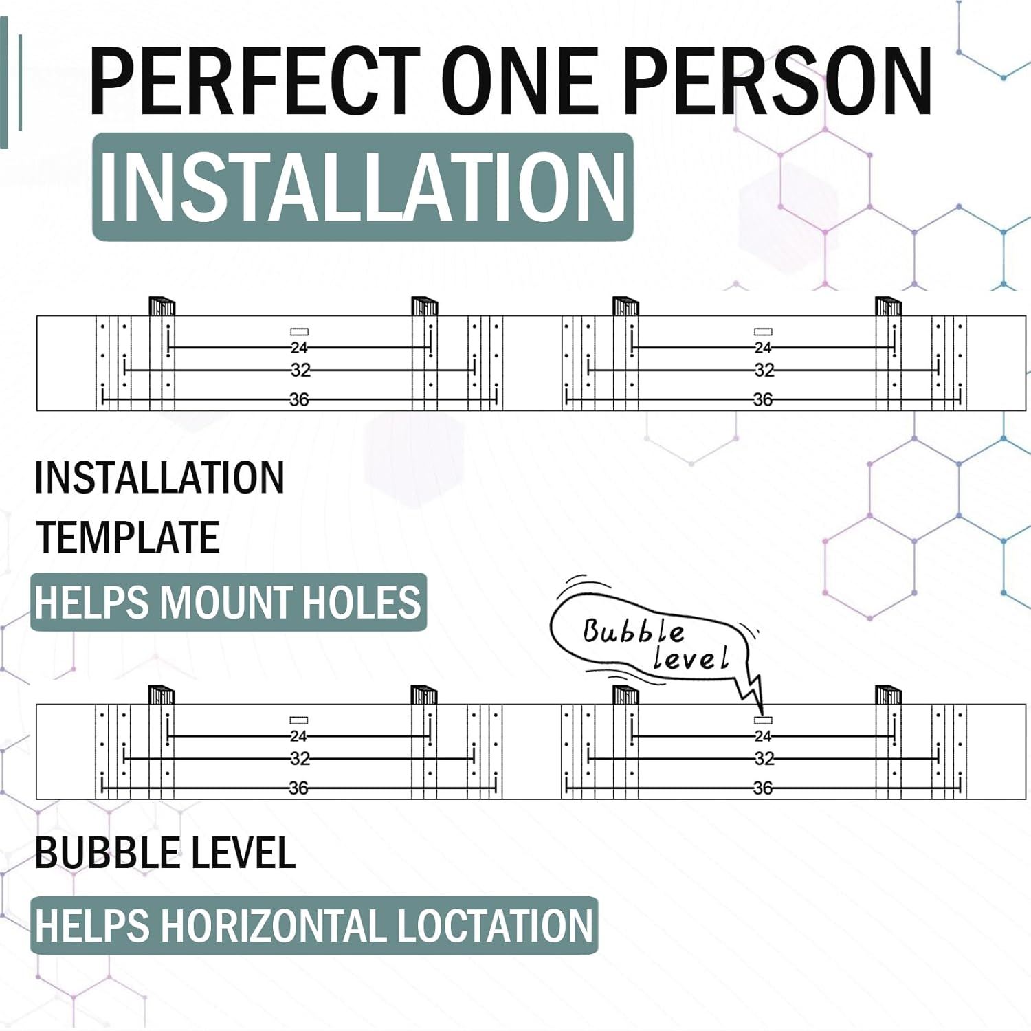 - ăQuick â Secure Setupă: Easy one-person installation with all hardware included: Installation Template helps mount holes; Bubble Level helps get perfect horizontal location.