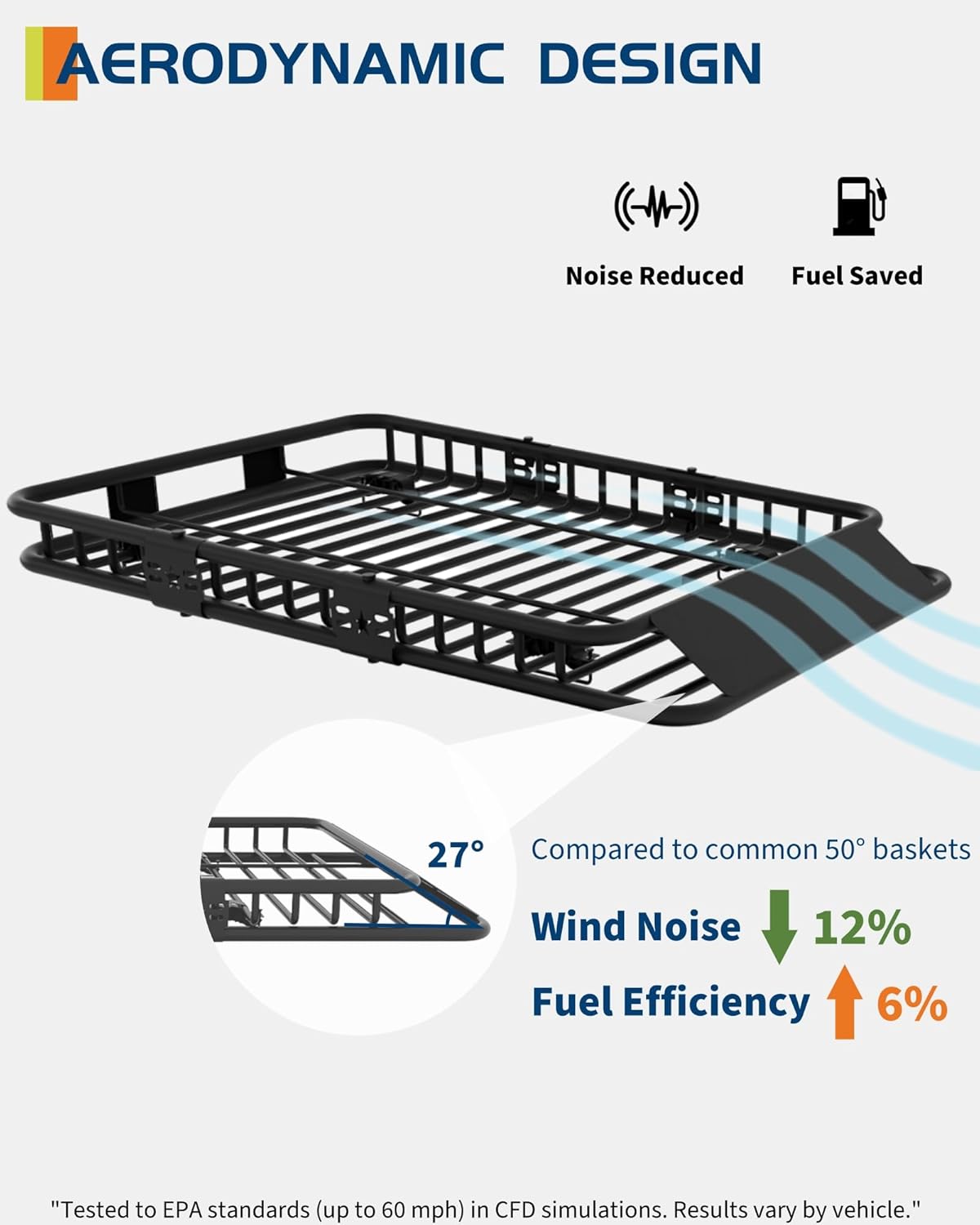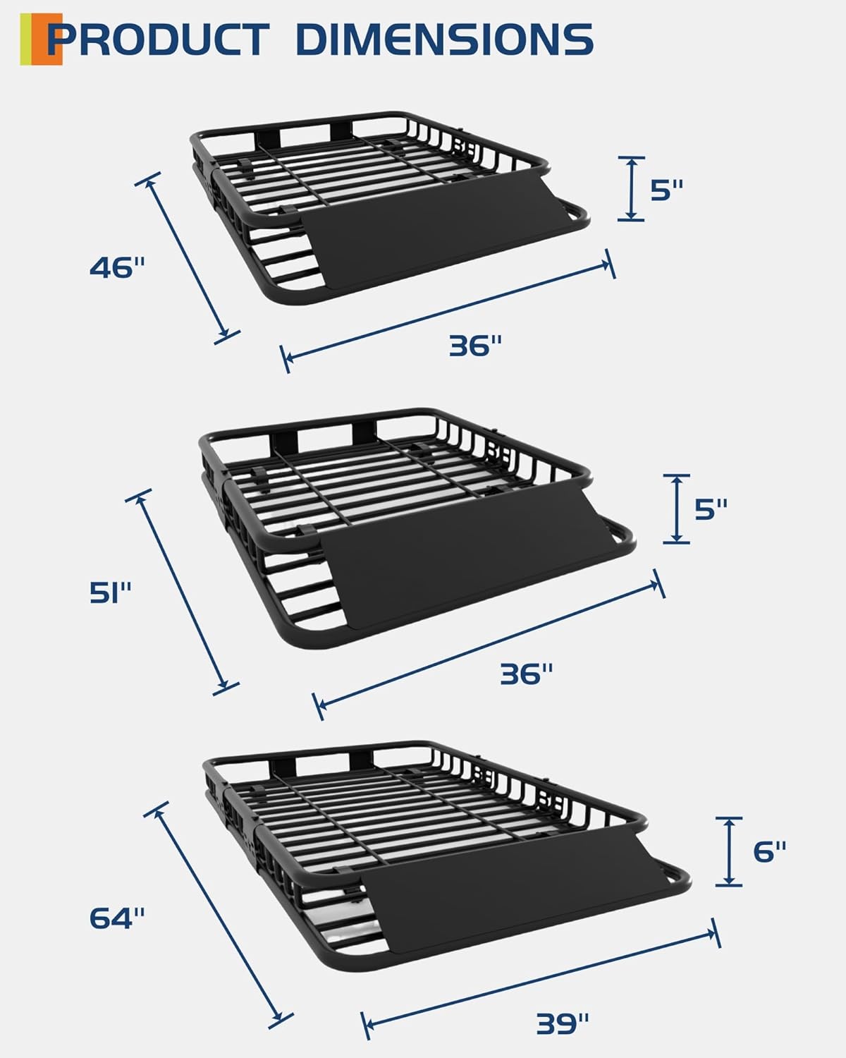 - 【LARGE STORAGE CAPACITY】Free up space in your vehicle with this roof rack cargo basket that can hold up to 200 Lbs. Overall dimensions include: 46"(L) x 36"(W) x 5"(H)
